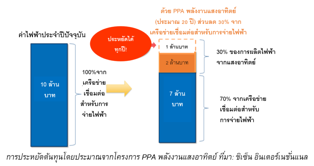 จากการที่รัฐบาลไทยได้ดำเนินการตามเป้าหมายการดำเนินการด้านสภาพอากาศอย่างจริงจัง พลังงานแสงอาทิตย์จึงเป็นแนวทางที่จะตอบสนองต่อความต้องการพลังงานที่เพิ่มขึ้นอย่างยั่งยืน การลงทุนของภาคเอกชนในการผลิตพลังงานแสงอาทิตย์ของตนเองจะมีบทบาทสำคัญในการบรรลุเป้าหมายเหล่านี้ การกระจายแหล่งพลังงานทำให้บริษัทต่าง ๆ มีความยืดหยุ่นเมื่อเผชิญกับการหยุดชะงักของอุปทาน และทำให้ธุรกิจสามารถใช้ประโยชน์จากอัตราภาษีพลังงานโดยใช้รูปแบบการแข่งขันทางด้านราคาได้เป็นระยะเวลานานถึง 20 ปี สิ่งสำคัญที่สุด คือ พลังงานแสงอาทิตย์คือพลังงานแห่งอนาคต และมีราคาถูกกว่าไฟฟ้าที่ส่งถึงเราผ่านสายส่งมากขึ้นเรื่อย ๆ นับเป็นการตัดสินใจที่ชาญฉลาดสำหรับธุรกิจทั้งในปัจจุบันและอนาคต