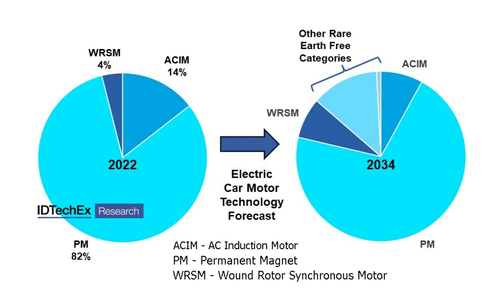 สิ่งที่มุ่งเน้นกันมากขึ้น โดยเฉพาะอย่างยิ่งนอกประเทศจีน คือ การลดปริมาณแร่หายากในมอเตอร์ไฟฟ้า โดยมีหลากหลายกลยุทธ์ ซึ่งแต่ละแบบมีการแลกเปลี่ยนและสร้างโอกาสระหว่างกันสำหรับผู้ผลิตมอเตอร์และผู้จัดหาวัสดุ โดย IDTechEx ได้คาดการณ์ว่า มอเตอร์ PM ที่ใช้แร่หายาก จะยังคงเป็นเทคโนโลยีที่โดดเด่น อย่างไรก็ตาม ตัวเลือกของการปราศจากแร่หายาก รวมทั้งประเด็นต่างๆ ที่กล่าวมาข้างต้น คาดว่าจะมีสัดส่วนเกือบ 30% ของตลาดในปี 2577