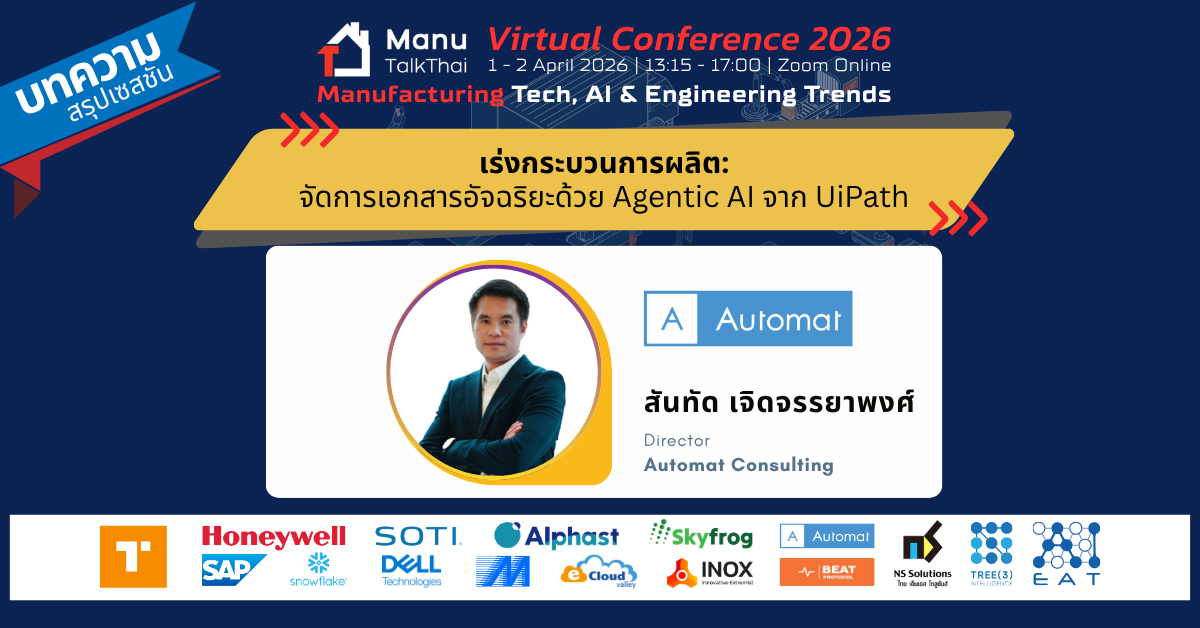 โดย คุณสันทัด เจิดจรรยาพงศ์ Director จาก Automat Consulting จากเวทีสัมมนาออนไลน์แห่งปี MTT Virtual Conference 2026 ภายใต้ธีม Manufacturing Tech, AI & Engineering Trends เมื่อวันที่ 1-2 เมษายน 2026