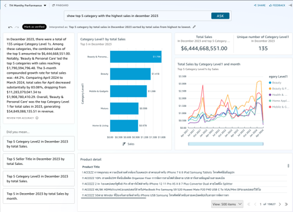 - aCommerce สร้างแดชบอร์ดธุรกิจที่ให้ผู้ใช้สามาถสื่อสารด้วยภาษาธรรมชาติ ด้วยบริการ Amazon Q in QuickSight ซึ่งเป็นผู้ช่วย Generative BI Assistant ที่ช่วยสร้างรายงานและเข้าถึงข้อมูลได้ง่ายขึ้น ทำให้ลูกค้าสามารถเข้าถึงข้อมูลเชิงลึกด้านอีคอมเมิร์ซผ่านแดชบอร์ดที่กำหนดเองได้ และเพิ่มประสิทธิภาพทางธุรกิจด้วยเทคโนโลยี Generative AI เพื่อการวิเคราะห์ข้อมูลและให้คำแนะนำที่แม่นยำและตรงจุด