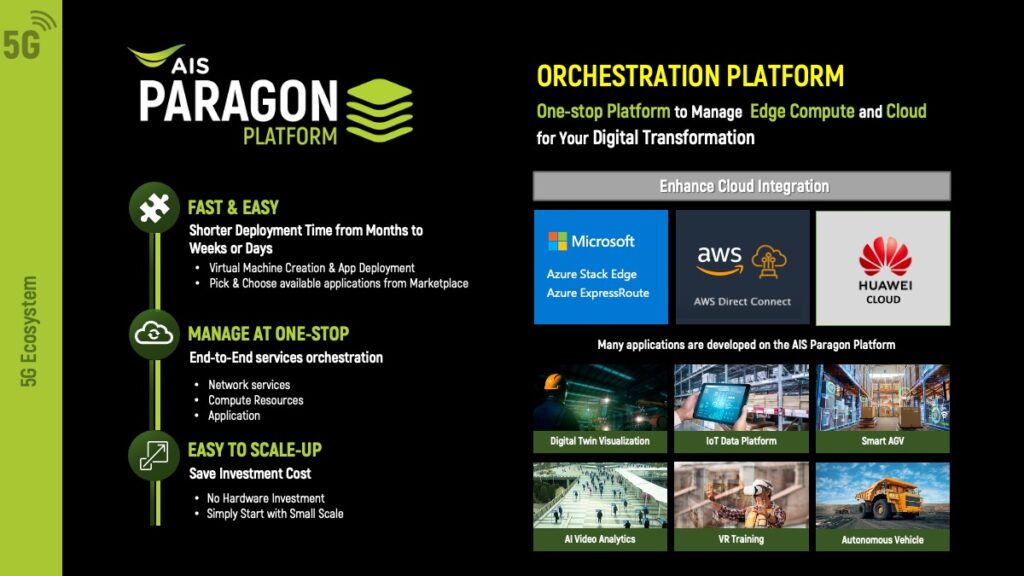 โดยปัจจุบัน AIS Paragon ได้มีแพลตฟอร์มจากผู้เชี่ยวชาญในโซลูชันเฉพาะด้านต่างๆเข้าร่วมมากมาย เช่น Schneider Electric, Mitsubishi Electric, SIEMENS, IBCON, ZTE, DataMesh และอื่นๆอีกมากมาย ที่นำเสนอโซลูชันที่สามารถพลิกโฉมการประกอบธุรกิจของท่านให้ล้ำสมัยมากขึ้นด้วยโครงสร้างพื้นฐาน Edge Computing Cloud และ 5G