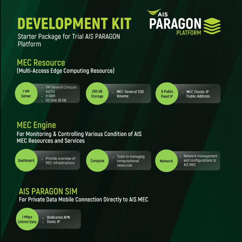และในกรณีที่ต้องการเริ่มต้นกับ AIS Paragon ล่าสุด AIS Business ได้จัดแพ็กเกจเริ่มต้นสำหรับผู้สนใจทุกท่าน ที่เรียกว่า ‘AIS Paragon Development Kit’ โดยภายในแพ็กเกจประกอบด้วย 3 ปัจจัยสำคัญที่พร้อมสำหรับการเริ่มต้นพัฒนาแอปพลิเคชันได้ทันทีคือ ชุดซิม 5G, ทรัพยากรเริ่มต้นสำหรับแอปพลิเคชัน และบริการ Professional Service ในรูปแบบแพ็กเกจรายเดือน