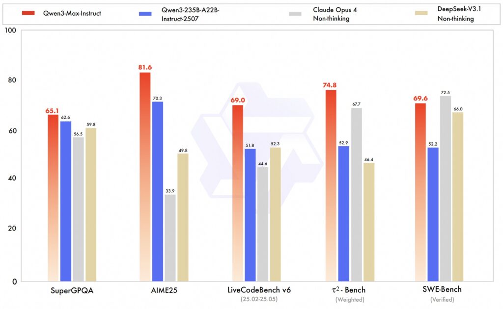 อาลีบาบา ได้เปิดตัว Qwen3-Max อย่างเป็นทางการในฐานะโมเดล LLM ขนาดใหญ่ที่สุดที่มีพารามิเตอร์กว่า 1 ล้านล้านตัว ด้วยโหมด Instruct (non-thinking) และ Thinking โมเดลนี้บรรลุประสิทธิภาพที่น่าประทับใจในการทำเบนช์มาร์ก (benmarks) ที่หลากหลาย โดยเฉพาะอย่างยิ่งในการสร้างโค้ดและความสามารถของเอเจนต์ สำหรับโหมด instruct ได้คะแนน 69.6 ใน SWE-Bench ซึ่งเป็นเบนช์มาร์กมาตรฐานสำหรับการประเมิน LLM ในประเด็นการใช้งานซอฟต์แวร์จริง ซึ่งเทียบเท่ากับโมเดลปิดชั้นนำบางรุ่น นอกจากนี้ยังทำสถิติคะแนนประสิทธิภาพที่โดดเด่นใน Tau2-Bench ซึ่งเป็นเบนช์มาร์กที่ประเมินเอเจนต์สนทนา แสดงให้เห็นถึงความเชี่ยวชาญพิเศษในการใช้เครื่องมือ ที่ถือเป็นความสามารถพื้นฐานสำหรับการสร้างเอเจนต์ที่ชาญฉลาดและเน้นการดำเนินการ
