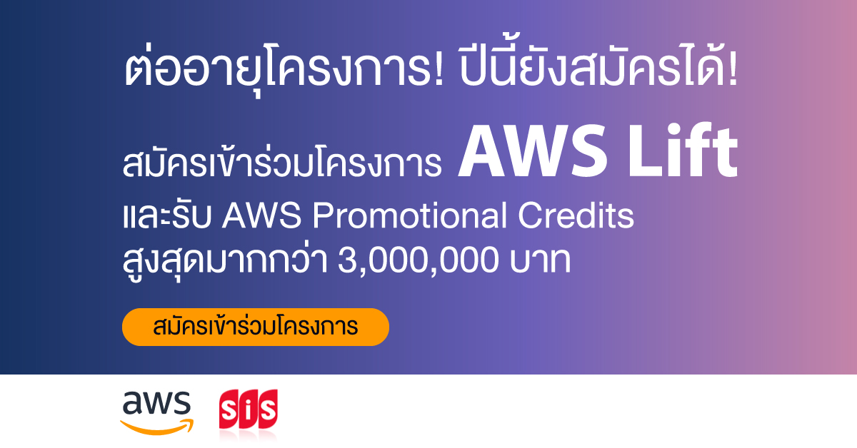 โครงการ AWS Lift เป็นโครงการที่จะแจก Credit สำหรับการใช้งานบริการ Cloud ของ AWS เริ่มต้นที่ 27,000 บาท และสามารถรับสิทธิ์เพิ่มเติมรวมสูงสุดได้กว่า 3,000,000 บาท เป็นระยะเวลานานถึง 12 เดือน เป็นอีกทางเลือกหนึ่งที่น่าสนใจที่จะทำให้สามารถเริ่มต้นใช้ Cloud ได้ในราคาคุ้มค่า และพัฒนาทักษะของทีมงาน IT ให้คุ้นเคยกับ AWS มากขึ้น