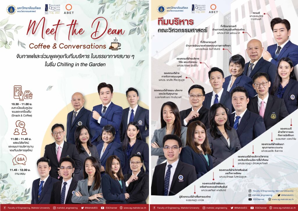 คณบดีวิศวะมหิดลคนใหม่ กล่าวถึง การพัฒนาแพลทฟอร์มงานวิจัยและนวัตกรรมรองรับเศรษฐกิจโลกยุคใหม่ ว่า เราจะสนับสนุนงานวิจัยทั้ง Fundamental และ Frontier Research ต่อยอดงานวิจัยขั้นสูง ผลักดันสร้างเสริมนักวิจัยสมรรถนะสูงเพื่อสร้างชื่อเสียงและ Ranking สนับสนุนเงินทุนแก่นักวิจัยและ นศ.ป.เอก ระดมทุนวิจัยจากแหล่งทุนภายในและต่างประเทศ พัฒนาความร่วมมือกับองค์กรเอกชนและภาคอุตสาหกรรมโดยมุ่งเน้นเป้าหมายการพัฒนาที่ยั่งยืน (SDG) ส่งเสริมการตีพิมพ์ผลงานวิจัยคุณภาพสูง สนับสนุนนักวิจัยรุ่นใหม่ สร้างสรรค์ Startups และผู้ประกอบการ