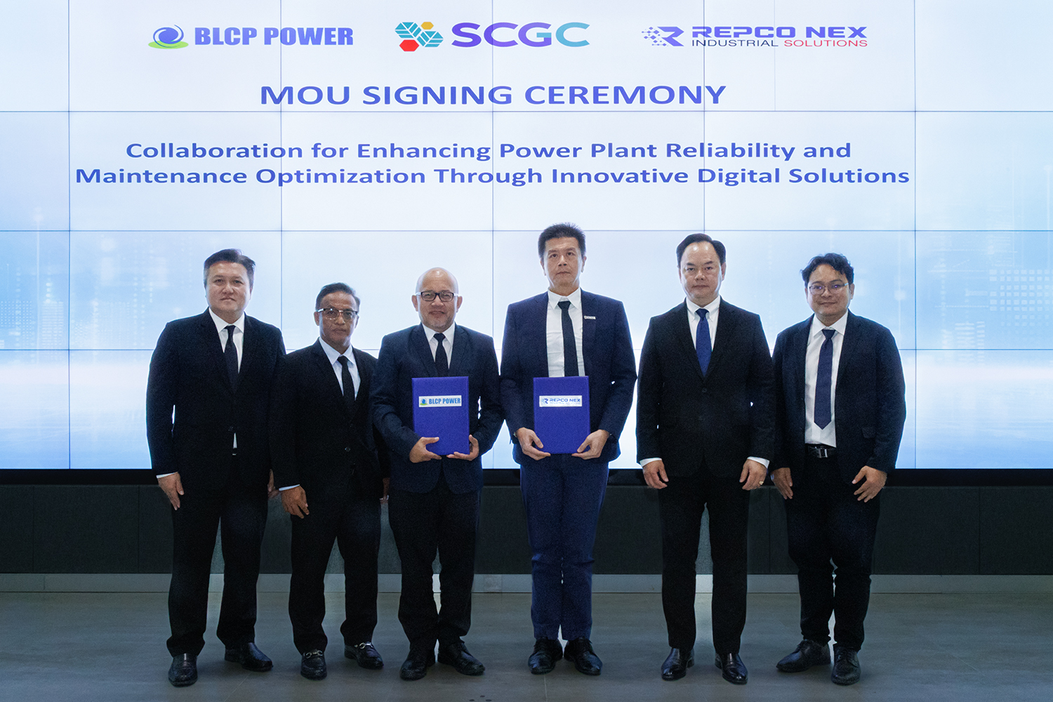นายยุทธนา เจริญวงศ์ (คนกลาง) กรรมการผู้จัดการ บริษัท บีแอลซีพี เพาเวอร์ จำกัด (BLCP Power Limited) พร้อมด้วย ดร. พิเชษฐ์ ตั้งปัญญารัช (ที่ 3 จากขวา) กรรมการผู้จัดการ บริษัท ระยองวิศวกรรมและซ่อมบำรุง จำกัด (REPCO)ร่วมลงนามบันทึกข้อตกลงความร่วมมือ (MOU) ในการนำเทคโนโลยีดิจิทัลขั้นสูง