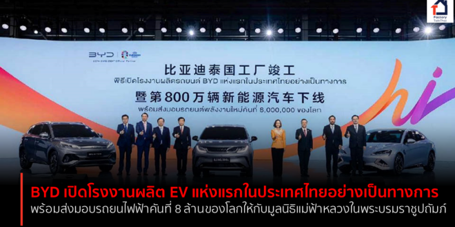 บีวายดี ร่วมกับบริษัท เรเวอร์ ออโตโมทีฟ จำกัด เปิดโรงงานผลิตรถยนต์ไฟฟ้า (EV) อย่างเป็นทางการในนิคมอุตสาหกรรมดับบลิวเอชเอ ระยอง 36 พร้อมส่งมอบรถยนต์ไฟฟ้าคันที่ 8 ล้านในชื่อ BYD DOLPHIN ให้กับมูลนิธิแม่ฟ้าหลวงในพระบรมราชูปถัมภ์ โรงงานแห่งนี้ครอบคลุมพื้นที่กว่า 948,000 ตารางเมตร ใช้เวลาก่อสร้าง 16 เดือน มีกำลังการผลิตสูงสุด 150,000 คันต่อปี โรงงานแห่งนี้ จะผลิตส่วนประกอบสำคัญ เช่น แบตเตอรี่และระบบไฟฟ้า คาดว่าจะสร้างงานได้มากกว่า 10,000 ตำแหน่ง นี่เป็นโรงงานแห่งแรกของบีวายดีในประเทศไทย โดยมีเป้าหมายเพื่อสร้างประเทศให้เป็นศูนย์กลางรถยนต์ไฟฟ้าของอาเซียน โรงงานแห่งนี้จะผลิตรถยนต์ไฟฟ้าพวงมาลัยขวา และจะเปิดตัวรถยนต์ไฟฟ้าและปลั๊กอินไฮบริดรุ่นใหม่ บีวายดี เข้าสู่ตลาดประเทศไทยเมื่อ 2 ปีที่แล้ว และได้รับการตอบรับเป็นอย่างดี ด้วยความสำเร็จสู่ตำแหน่งผู้นำด้านการขายรถยนต์ไฟฟ้าเป็นระยะเวลา 18 เดือนติดต่อกัน บีวายดี วางแผนที่จะเปิดตัวรถยนต์ไฟฟ้าและปลั๊กอินไฮบริด 100% เพิ่มเติมในประเทศไทย บริษัทจะผสมผสานความเป็นเลิศด้านการผลิตในท้องถิ่นเข้ากับเทคโนโลยีพลังงานขั้นสูงของบีวายดี เพื่อกระชับความสัมพันธ์ระหว่างจีนและไทยให้แน่นแฟ้นยิ่งขึ้น ที่มา : https://www.kaohooninternational.com/markets/541761