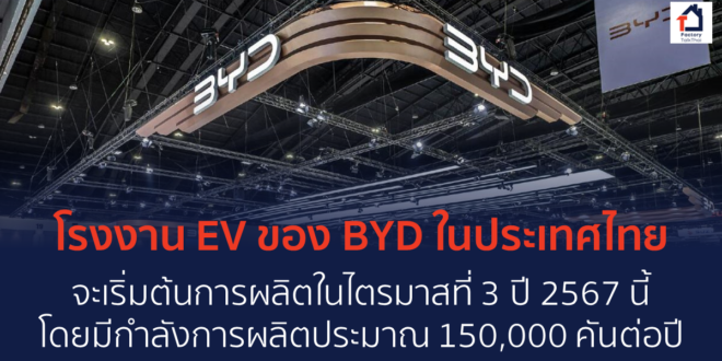 โรงงานรถยนต์ไฟฟ้า (EV) ของ BYD ในประเทศไทย เริ่มก่อสร้างเมื่อเดือนมีนาคมปี 2566 จะแล้วเสร็จและเข้าสู่การผลิตในไตรมาสที่ 3 ของปี 2567 นี้ Image Credit : BYD บีวายดีได้ประกาศแผนดังกล่าวในงานแสดงรถยนต์ที่กรุงเทพฯ ซึ่งมีแบรนด์ต่างๆ ในเครืออย่าง BYD, Yangwang, Fang Cheng Bao และ Denza เข้าร่วมด้วย การลงทุนของ BYD ในประเทศไทย จะนำมาเทคโนโลยีการผลิตขั้นสูง โมเมนตัมการพัฒนาอุตสาหกรรม และเกิดการจ้างงานในท้องถิ่นจำนวนมาก ย้อนไปเมื่อแรกเริ่ม BYD ได้ลงนามในสัญญาซื้อที่ดินกับบริษัทพัฒนาอสังหาริมทรัพย์เพื่ออุตสาหกรรมของไทย บริษัท ดับบลิวเอชเอ อินดัสเตรียล ดีเวลลอปเมนท์ จำกัด (มหาชน) ซึ่งเป็นบริษัทในเครือของกลุ่มดับบลิวเอชเอ ย้อนกลับไปเมื่อเดือนกันยายน 2565 เพื่อสร้างโรงงานรถยนต์ไฟฟ้า เมื่อวันที่ 10 มีนาคม 2566 BYD ได้จัดพิธีวางศิลาฤกษ์สำหรับโรงงานแห่งนี้ รวมถึงพิธีส่งมอบโรงงานแห่งที่ 9,999 และแห่งที่ … Continue reading โรงงาน EV ของ BYD ในประเทศไทย จะเริ่มต้นการผลิตในไตรมาสที่ 3 ปี 2567 นี้ โดยมีกำลังการผลิตประมาณ 150,000 คันต่อปี