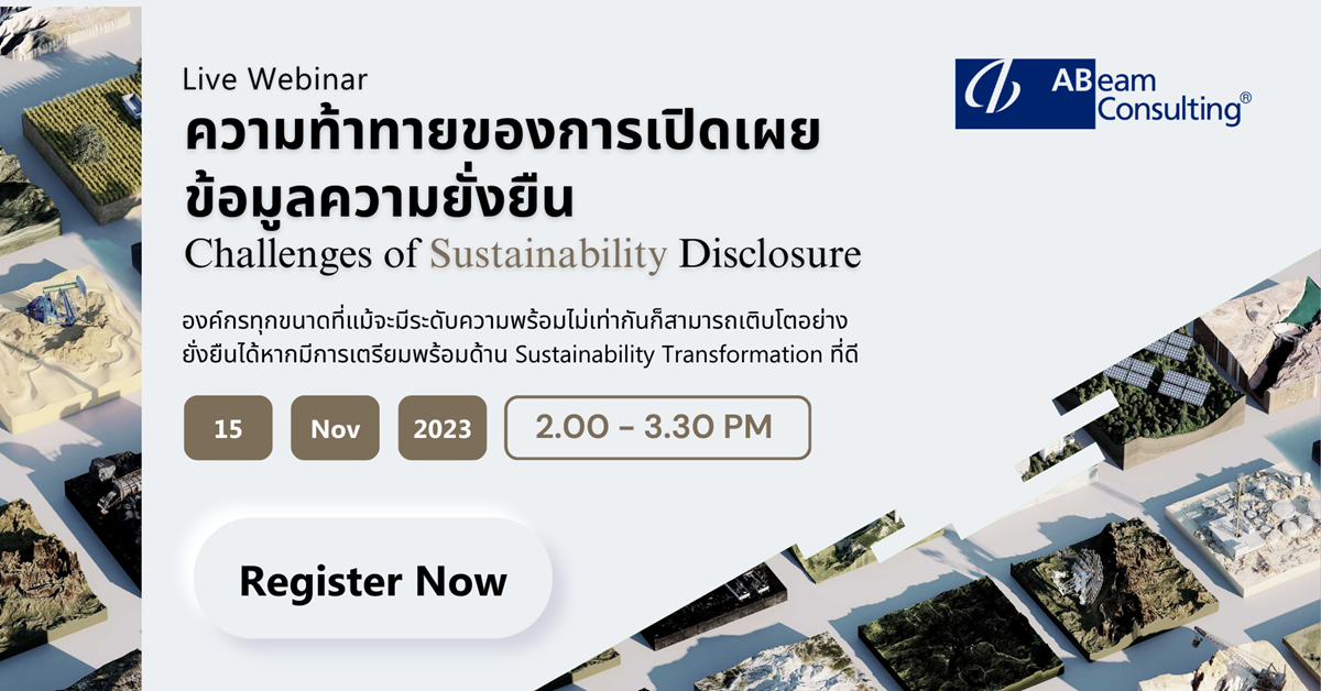 TechTalkThai และ ABeam Consulting ขอเรียนเชิญทุกท่านเข้าร่วมงานสัมมนาออนไลน์ในหัวข้อ “ความท้าทายของการเปิดเผยข้อมูลความยั่งยืน” เพื่อให้ทุกท่านได้มาร่วมเรียนรู้ถึงวิธีการและโซลูชันที่จะช่วยวัดผลข้อมูลความยั่งยืนได้อย่างแม่นยำ สกัดนำข้อมูลออกมาใช้ตอบโจทย์นโยบายและระเบียบข้อบังคับจากกฏหมายด้านสิ่งแวดล้อม