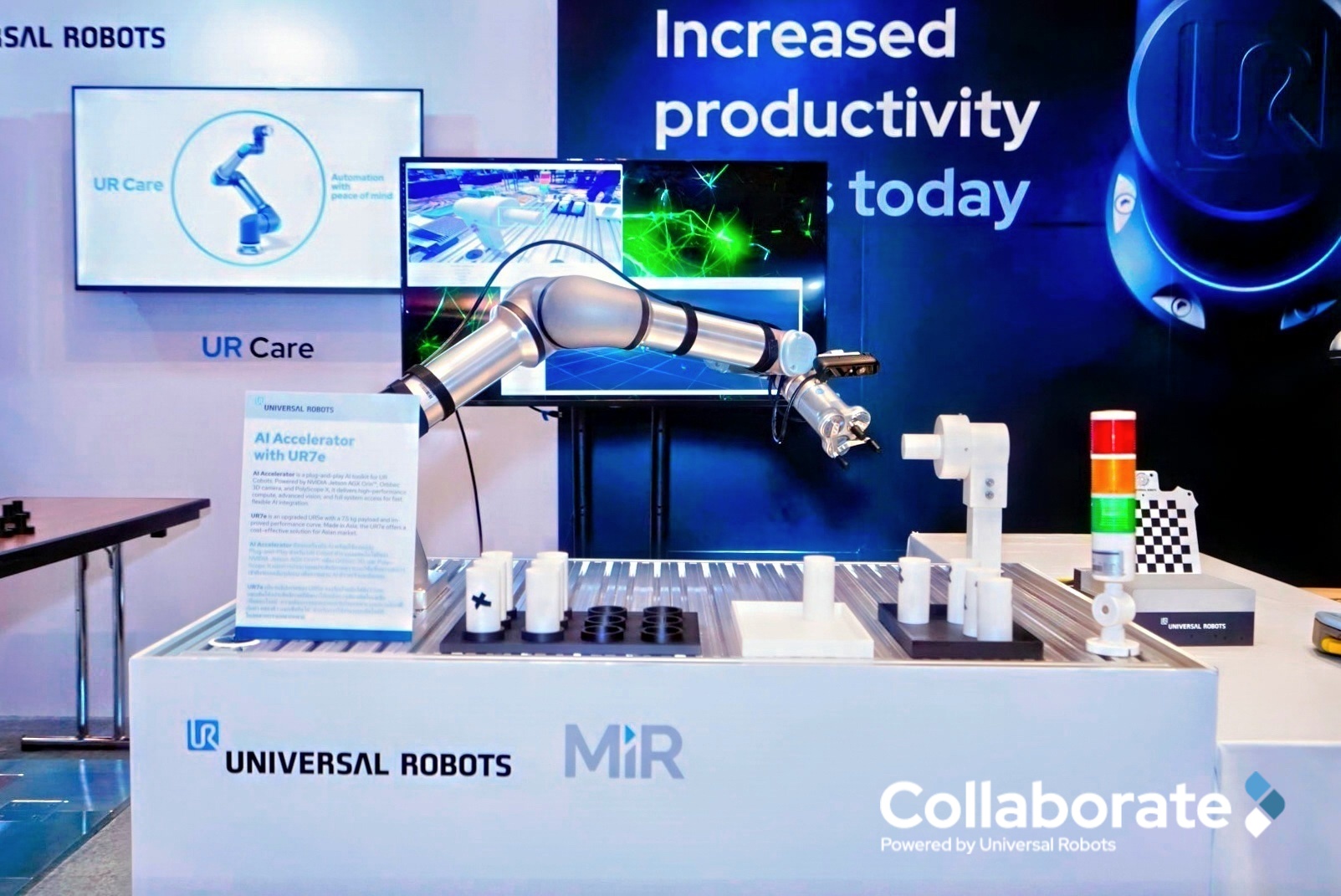 AI Accelerator ของ UR ออกแบบมาเพื่อมอบความสามารถด้านปัญญาประดิษฐ์และการปรับตัวอย่างชาญฉลาดให้กับระบบอัตโนมัติ ถือเป็นอีกหนึ่งไฮไลท์สำคัญของงาน โดย AI Accelerator ของ UR ทำงานบนระบบโมดูล NVIDIA Jetson AGX Orin และขับเคลื่อนด้วยชุดเครื่องมือเร่งความเร็วด้วย CUDA ของ NVIDIA Isaac และโมเดล AI ทำให้สามารถมอบแพลตฟอร์มที่ยืดหยุ่นให้กับนักพัฒนาในการสร้างและทดสอบแอปพลิเคชัน ลดระยะเวลาการออกสู่ตลาด และช่วยแก้ปัญหาที่เคยเป็นไปไม่ได้ในวงการหุ่นยนต์ร่วมปฏิบัติงาน อีกทั้งแพลตฟอร์มนี้ช่วยให้สามารถพัฒนาโซลูชันระบบอัตโนมัติที่ใช้ AI ได้อย่างรวดเร็ว ครอบคลุมการใช้งาน เช่น การตรวจจับวัตถุด้วย AI (AI Object Detection), การวางแผนเส้นทางอัจฉริยะ (Smart Path Planning), การตรวจหาความบกพร่องด้วย AI (AI Defect Detection) และ การปรับพื้นที่ทำงานให้แม่นยำ(Workspace Calibration)