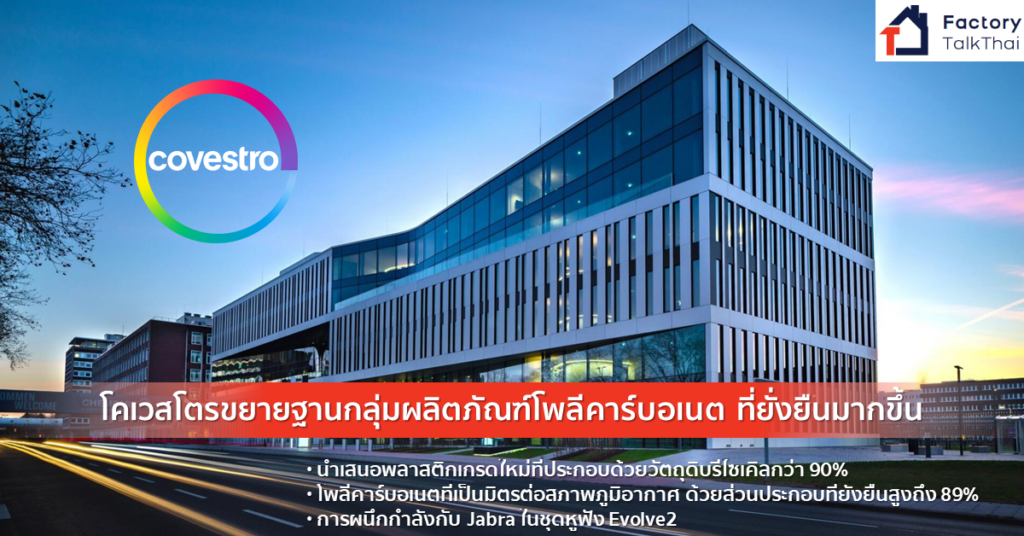 หนึ่งในตัวอย่างการนำโพลีคาร์บอเนต Bayblend® FR3010 R75 ของโคเวสโตรในการผลิตที่ครอบหูของชุดหูฟังซีรีส์ล่าสุด Evolve2 ของแบรนด์เดนมาร์กอย่าง Jabra ซึ่งเป็นอุปกรณ์ด้านระบบเสียงและระบบการประชุมผ่านวิดีโอ โดยพลาสติกประเภทนี้ประกอบด้วยวัสดุรีไซเคิล 75% และมีปริมาณคาร์บอน