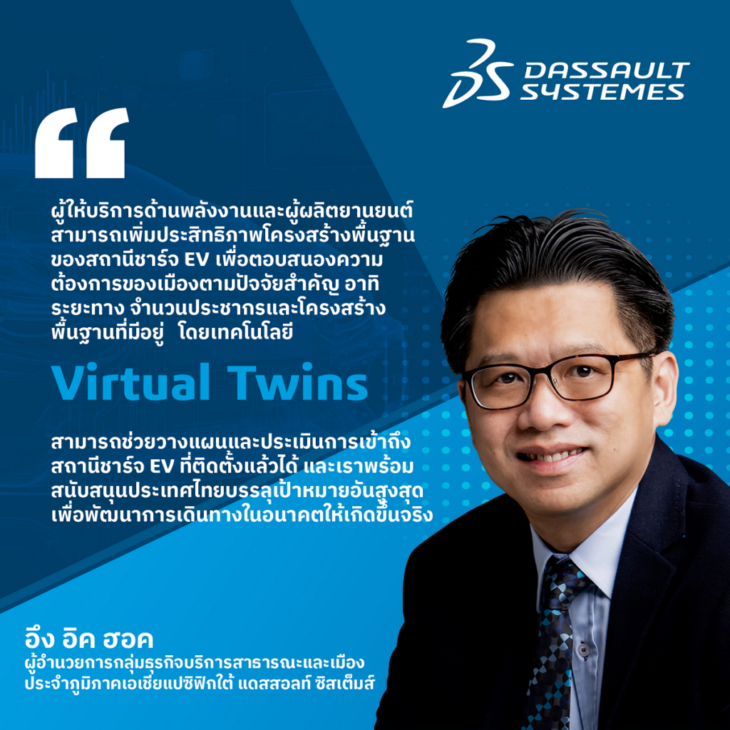 นาย อึง อิค ฮอคผู้อำนวยการกลุ่มธุรกิจบริการสาธารณะและเมือง ประจำภูมิภาคเอเชียแปซิฟิกใต้ แดสสอลท์ ซิสเต็มส์ กล่าวว่า “ปัจจุบันมีการนำแพลตฟอร์ม 3DEXPERIENCE ของแดสสอลท์ ซิสเต็มส์ ไปใช้พัฒนายานพาหนะไฟฟ้าสูงถึง 85% ของโลก โดยผู้ผลิตสามารถเร่งกระบวนการพัฒนาและลดต้นทุนการผลิตในด้านต่าง ๆ ด้วยการสร้างแบบจำลองคู่แฝดเสมือนของรถยนต์และนำไปใช้จำลองการทดสอบสมรรถนะรถยนต์เสมือนจริง นอกจากนี้ผู้ผลิตยังได้รับข้อมูลและความรู้เชิงลึกสำหรับการสร้างที่ยั่งยืนตลอดวงจรชีวิตผลิตภัณฑ์ เช่นเดียวกับการทำงานร่วมกันบนแพลตฟอร์ม 3DEXPERIENCE ที่ช่วยให้ นักผังเมือง ผู้ให้บริการด้านพลังงานและผู้ผลิตยานยนต์สามารถเพิ่มประสิทธิภาพโครงสร้างพื้นฐานของสถานีชาร์จ EV เพื่อตอบสนองความต้องการของเมืองตามปัจจัยสำคัญ อาทิ ระยะทาง จำนวนประชากรและโครงสร้างพื้นฐานที่มีอยู่ โดยเทคโนโลยี Virtual Twins สามารถช่วยวางแผนและประเมินการเข้าถึงสถานีชาร์จ EV ที่ติดตั้งแล้วได้ และเราพร้อมสนับสนุนประเทศไทยบรรลุเป้าหมายอันสูงสุดเพื่อพัฒนาการเดินทางในอนาคตให้เกิดขึ้นจริง”