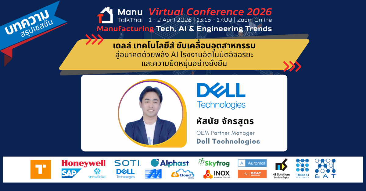 จากการจัดงานสัมมนาออนไลน์ MTT Virtual Conference 2026: Manufacturing Tech, AI & Engineering Trends เมื่อวันที่ 1-2 เมษายน 2026 ที่ผ่านมา ทีมงาน ManuTalkThai ได้รวบรวมสรุปเนื้อหาจากเซสชันการบรรยายมาไว้ในรูปแบบตัวอักษร บทความนี้พบกันในหัวข้อ “เดลล์ เทคโนโลยีส์ ขับเคลื่อนอุตสาหกรรมสู่อนาคตด้วยพลัง AI, Smart Factory และความยืดหยุ่นอย่างยั่งยืน” บรรยายโดย คุณหัสนัย จักรสูตร OEM Partner Manager จาก Dell Technologies ซึ่งได้มาเจาะลึกถึงสถาปัตยกรรมทางเทคโนโลยี (Technology Architecture) และกลยุทธ์ที่โรงงานอุตสาหกรรมต้องเตรียมพร้อมเพื่อรับมือกับความผันผวนของโลกยุคใหม่