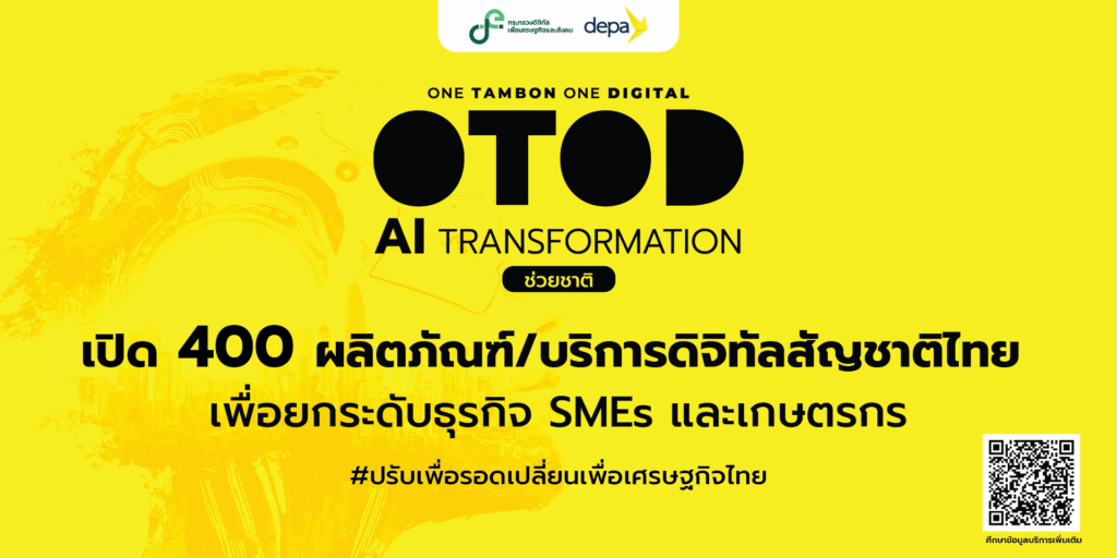 ดีป้า เผย 400 รายการผลิตภัณฑ์และบริการดิจิทัลจาก Digital Provider สัญชาติไทยในโครงการ OTOD AI Transformation ช่วยชาติ เร่งเสริมแกร่งผู้ประกอบการ SMEs ร้านค้า ขนาดเล็ก หาบเร่ แผงลอย และเกษตรกร รวม 15,600 ราย เปลี่ยนผ่านธุรกิจสู่ยุคดิจิทัล พร้อมยกระดับขีดความสามารถทางการแข่งขัน และต่อยอดสู่ตลาดสากล