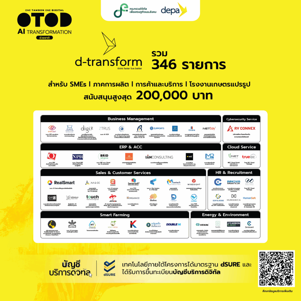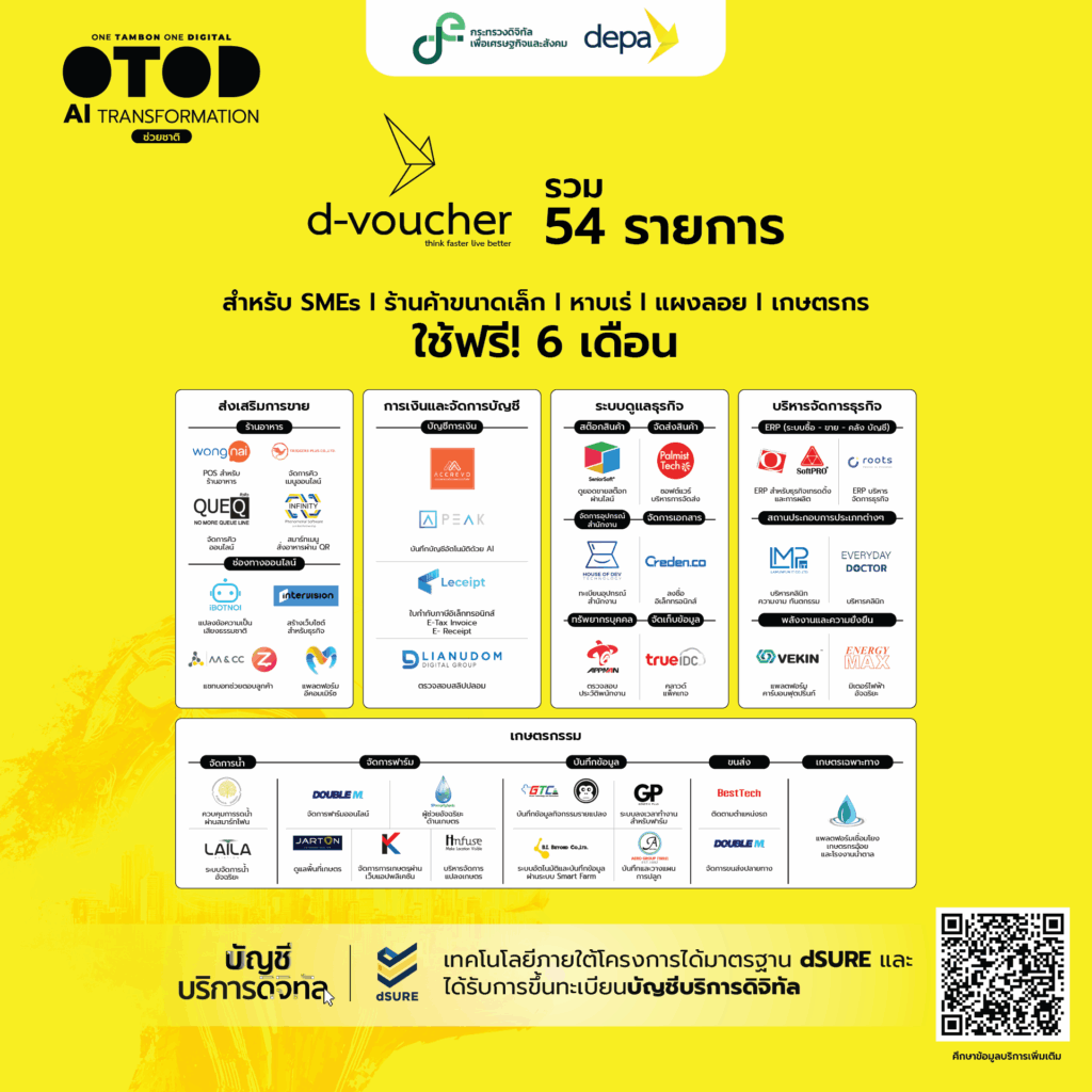สำหรับการส่งเสริมผ่านโครงการ OTOD AI Transformation ช่วยชาติ แบ่งออกเป็น 2 รูปแบบ ได้แก่ 1) ยกระดับธุรกิจด้วยดิจิทัลตามมาตรการ d-transform วงเงินสนับสนุนสูงสุดไม่เกิน 200,000 บาท โดยมีกลุ่มเป้าหมายอยู่ที่ผู้ประกอบการ SMEs รวม 600 ราย (กลุ่มธุรกิจภาคการผลิต 200 ราย | กลุ่มธุรกิจการค้าและบริการ 300 ราย | กลุ่มเกษตรแปรรูป 100 ราย) และมีผลิตภัณฑ์/บริการดิจิทัล จำนวน 346 รายการ จาก Digital Provider จำนวน 52 รายให้เลือกนำไปประยุกต์ใช้ 2) เริ่มต้นใช้งานดิจิทัลตามมาตรการ d-voucher มอบสิทธิ์การใช้ดิจิทัลโดยไม่มีค่าใช้จ่าย ระยะเวลาอย่างน้อย 6 เดือน มีกลุ่มเป้าหมายอยู่ที่ SMEs ร้านค้าขนาดเล็ก หาบเร่ แผงลอย 10,000 ราย และเกษตรกร 5,000 ราย มีผลิตภัณฑ์/บริการดิจิทัล จำนวน 54 รายการ จาก Digital Provider จำนวน 40 รายให้เลือกใช้งาน
