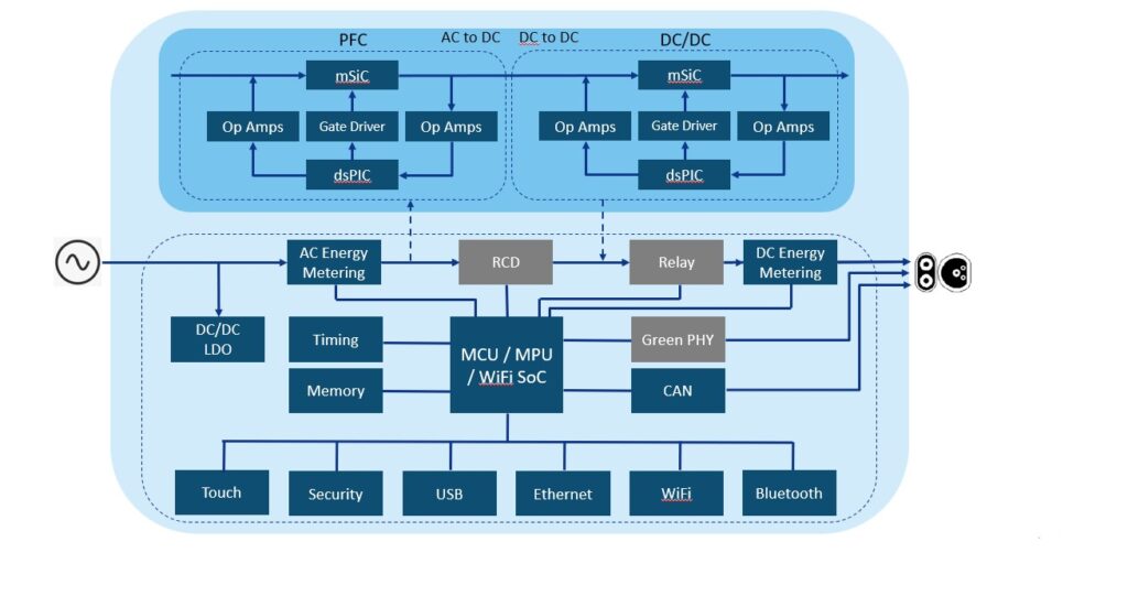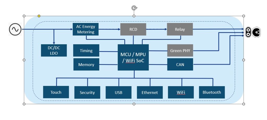 ทั้งระดับ 1 และระดับ 2 มาพร้อมกับฮาร์ดแวร์ขั้นสูงเพื่อตรวจสอบและจ่ายไฟให้กับรถยนต์ไฟฟ้าอย่างปลอดภัยและมีประสิทธิภาพ ซึ่งรวมถึงไมโครคอนโทรลเลอร์ (MCU) ระบบจัดการพลังงาน ตัวเลือกการเชื่อมต่อแบบไร้สายและแบบใช้สาย เซนเซอร์อุณหภูมิ การวัดพลังงาน อินเทอร์เฟซระหว่างมนุษย์และเครื่องจักร (HMI) และคุณสมบัติด้านความปลอดภัย นอกจากนี้ สถานีชาร์จส่วนใหญ่ยังมาพร้อมกับแหล่งจ่ายไฟเสริม ตัวควบคุม DC-DC, PMIC และฮาร์ดแวร์เพิ่มเติม เพื่อให้มั่นใจได้ถึงความปลอดภัยและเสถียรภาพของพลังงานขณะชาร์จด้วยเช่นกัน