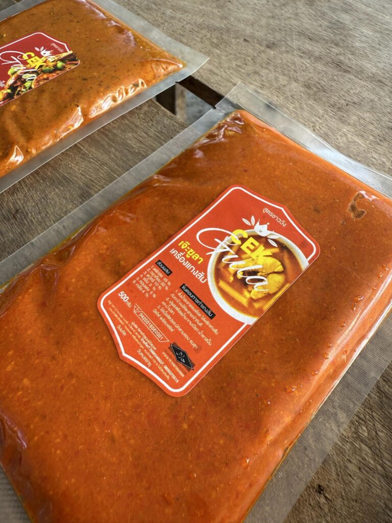 ในส่วนของการพัฒนาผลิตภัณฑ์นั้น จากการพูดคุยและนำผลิตภัณฑ์ไปทดสอบร่วมกับร้านต้มยำต่างๆ แล้วพบว่าเครื่องแกงมีโอกาสสูงในการทำตลาดเพื่อการส่งออกให้กับร้านอาหารกลุ่มนี้ ทีมวิจัยจึงนำข้อเสนอแนะจากร้านต้มยำมาให้วิสาหกิจชุมชนนิปิสกุเละ ที่ผลิตเครื่องแกงแบรนด์เจ๊ะฆูลาดำเนินการปรับปรุงรสชาติ ลดความเผ็ด ลดความเค็มลง จนได้สูตรที่ตรงความต้องการแล้ว ก็มีการไปทดลองเรื่องอายุเครื่องแกง และร่วมกับอาจารย์จากมหาวิทยาลัยสงขลานครนิทร์ วิทยาเขตปัตตานี ในการยืดอายุการเก็บเครื่องแกงในอุณหภูมิปกติจาก 1 สัปดาห์เป็น 1 เดือน และเก็บในห้องเย็นได้นานถึง 1 ปี