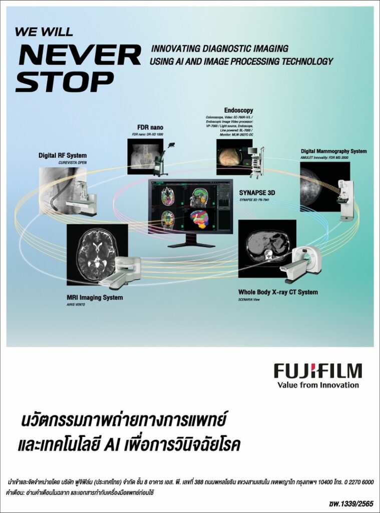 มร. โซ มารูโอะ กรรมการผู้จัดการ บริษัท ฟูจิฟิล์ม (ประเทศไทย) จำกัด กล่าวว่า “ฟูจิฟิล์ม ก้าวสู่ธุรกิจการแพทย์และสุขภาพมาตั้งแต่ปี ค.ศ. 1936 หรือราว ๆ 80 ปีที่แล้ว ด้วยการนำเสนอผลิตภัณฑ์ฟิล์มเอกซเรย์ที่เป็นที่ยอมรับจากวงการแพทย์ทั่วโลก โดยหลังจากประกาศควบรวมกิจการของ Hitachi Healthcare ในปี 2021 และเปลี่ยนชื่อเป็น Fujifilm Healthcare Corporation ธุรกิจทางการแพทย์และสุขภาพของฟูจิฟิล์มก็แข็งแกร่งยิ่งขึ้นกว่าเคย โดยเฉพาะในด้านเทคโนโลยีเกี่ยวกับการถ่ายภาพทางการแพทย์ เพราะนอกจากเครื่องเอกซเรย์ดิจิทัล, กล้องส่องตรวจระบบทางเดินอาหาร, เครื่องอัลตราซาวด์, เครื่องแมมโมแกรมตรวจเอกซเรย์เต้านม ก็ยังได้เทคโนโลยี MRI และ CT Scan มาเสริมทัพให้โซลูชันการวินิจฉัยทางการแพทย์ของฟูจิฟิล์มครบวงจรมากยิ่งขึ้น และยิ่งไปกว่านั้น เมื่อเครื่องมือเหล่านี้ได้ทำงานร่วมกับเทคโนโลยี AI ทางการแพทย์ขั้นสูงและระบบสารสนเทศทางการแพทย์อย่าง Synapse 3D โปรแกรมสร้างภาพทางการแพทย์รูปแบบสามมิติก็ยิ่งยกระดับการตรวจวินิจฉัยโรคได้อย่างแม่นยำและรวดเร็วยิ่งขึ้น ทำให้ฟูจิฟิล์มก้าวเป็นบริษัทชั้นนำในธุรกิจทางการแพทย์และสุขภาพ ในฐานะผู้ให้บริการ Total Healthcare Solution ชั้นนำอย่างแท้จริง”
