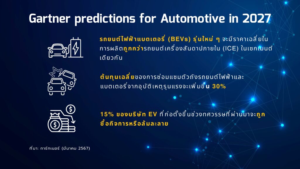 ในปี 2567 ตลาดรถยนต์ไฟฟ้าจะยังเติบโตต่อเนื่อง โดยการ์ทเนอร์คาดการณ์ปีนี้จะมียอดจัดส่งรถยนต์ไฟฟ้าสูงถึง 18.4 ล้านคัน และเพิ่มเป็น 20.6 ล้านคันในปี 2568 อย่างไรก็ตาม อุตสาหกรรมนี้กำลังพัฒนาจาก ‘ยุคตื่นทอง’ ไปสู่ ‘ยุคผู้เหมาะสมที่สุดเท่านั้นจึงอยู่รอด’ ซึ่งหมายความว่าความสำเร็จของบริษัทต่าง ๆ ในอุตสาหกรรมนี้ ณ ปัจจุบัน ถูกจำกัดความสามารถอย่างหนักในการตอบสนองต่อความต้องการของผู้ใช้ EV ในยุคแรก ๆ