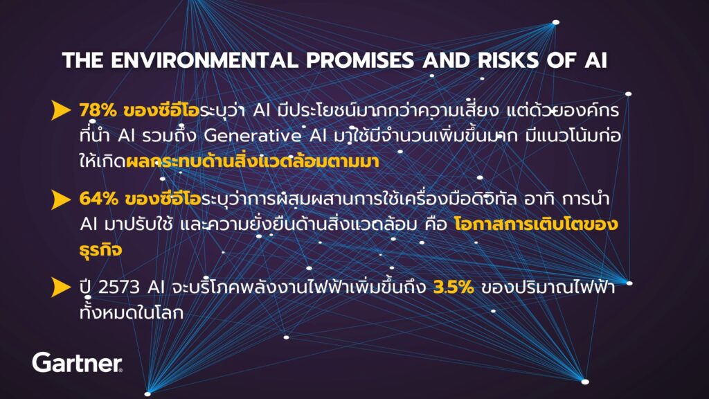 กรุงเทพฯ ประเทศไทย 28 พฤศจิกายน 2566 — การ์ทเนอร์เผยประโยชน์ของปัญญาประดิษฐ์ หรือ AI ต้องสมดุลกับผลกระทบต่อสิ่งแวดล้อมและผลที่เกิดตามมาโดยไม่ได้ตั้งใจจากฮาร์ดแวร์ โมเดลการฝึกและการใช้พลังงาน โดย CIO สามารถใช้ความรู้และรากฐานดิจิทัลของตนมาสนับสนุนความพยายามในการเดินหน้าไปสู่ความยั่งยืนขององค์กรเมื่อเริ่มนำ AI มาใช้