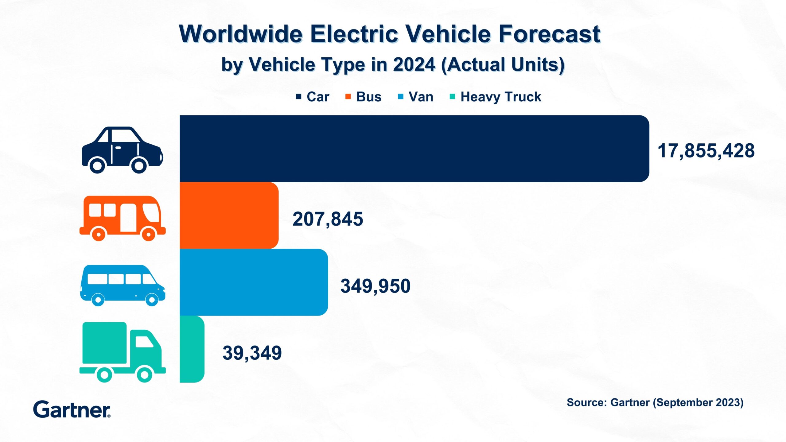 การ์ทเนอร์คาดการณ์ว่า ในปี 2567 ปริมาณการจัดส่งยานยนต์ไฟฟ้า (EV) ทั้งหมด ตั้งแต่ รถยนต์ (Cars) รถโดยสาร (Buses) รถตู้ (Vans) และรถบรรทุกขนาดใหญ่ (Heavy Trucks) จะมียอดรวมที่ 18.5 ล้านคัน โดยในกลุ่มรถยนต์ไฟฟ้าจะคิดเป็น 97% ของยอดการจัดส่งยานยนต์ไฟฟ้าทั้งหมดในปีหน้า (ดูตารางที่ 1)