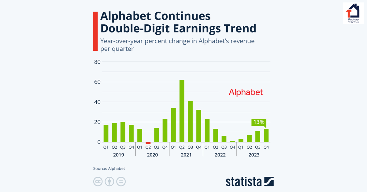 บริษัทแม่ Alphabet ของ Google ประกาศรายได้รายไตรมาสล่าสุด เติบโตขึ้น 13% เปอร์เซ็นต์ ซึ่งเป็นส่วนหนึ่งของรายงานผลประกอบการไตรมาสที่ 4 ปี 2023 นับเป็นครั้งที่สองติดต่อกันที่ Google มีอัตราการเติบโตเป็นตัวเลขสองหลักเมื่อเทียบเป็นรายปี นับตั้งแต่ไตรมาสที่ 2 ปี 2023