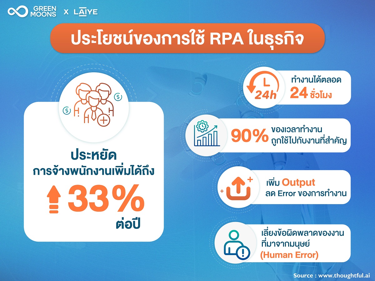 หากเปรียบเทียบให้เห็นภาพ RPA มีความสามารถในการประมวลผลธุรกรรมได้ตั้งแต่ 3,500 ไปจนถึง 10,000 รายการต่อชั่วโมง และด้วยความแม่นยำมากกว่า 90% ปฏิเสธไม่ได้ว่าสิ่งเหล่านี้ถือเป็นข้อจำกัดที่มนุษย์ไม่สามารถทำได้ในระยะเวลาเท่ากัน RPA จากกรีนมูนส์ (Greenmoons) จึงตอบโจทย์ในสมการครั้งนี้ ไม่เพียงแต่จะปรับปรุงการดำเนินงานให้ดีขึ้นในทันที แต่ยังเปรียบเสมือนผู้ช่วยหลัก ที่เป็นกลไกสำคัญทำให้ธุรกิจเติบโตได้อย่างคล่องตัว อีกทั้งมีศักยภาพในการลดต้นทุนด้านแรงงานลงได้มากกว่าได้ถึง 50% ทำให้เทคโนโลยี RPA กลายเป็นเครื่องมือที่ขาดไม่ได้สำหรับบริษัทที่ต้องการการทำงานที่มีประสิทธิภาพมากขึ้นและประหยัดต้นทุนควบคู่ไปพร้อมๆ กัน