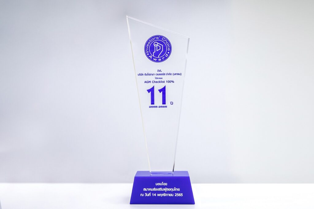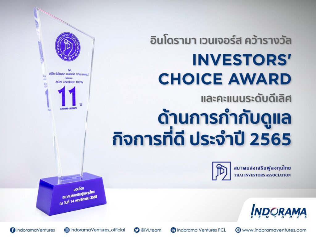 กรุงเทพฯ ประเทศไทย – 24 พฤศจิกายน 2565 – บริษัท อินโดรามา เวนเจอร์ส จำกัด (มหาชน) หรือ ไอวีแอล บริษัทเคมีภัณฑ์ชั้นนำระดับโลกที่ดำเนินธุรกิจอย่างยั่งยืน ได้รับรางวัล Investors’ Choice Award ในฐานะบริษัทจดทะเบียนในตลาดหลักทรัพย์แห่งประเทศไทยต่อเนื่องเป็นปีที่ 11 ที่ได้รับคะแนนในโครงการการประเมินคุณภาพการจัดประชุมสามัญผู้ถือหุ้น 100 คะแนนเต็ม จากสมาคมส่งเสริมผู้ลงทุนไทย สะท้อนถึงการให้ความสำคัญต่อการเปิดเผยข้อมูล และการให้ความเท่าเทียมกันของผู้ถือหุ้น
