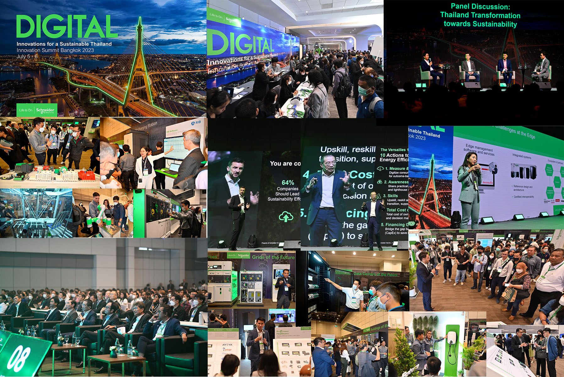 จบงาน Innovation Summit Bangkok 2023 กับงานแสดงเทคโนโลยีและแนวคิดด้านความยั่งยืนของ ชไนเดอร์ อิเล็คทริค เมื่อวันที่ 5-6 กรกฎาคม 2566 ที่ผ่านมา ด้วยจำนวนผู้เข้าร่วมงานมากกว่า 2,000 คน ทั้งภาครัฐ ภาคเอกชน พันธมิตรคู่ค้า รวมถึงนักศึกษา และผู้ให้ความสนใจด้านเทคโนโลยีและความยั่งยืน ในงานมีการจัดหัวข้อสัมมนามากกว่า 50 หัวข้อ นำเสนอแนวคิดจากองค์กรชั้นนำ โดยผู้นำทางความคิดจากธุรกิจต่างๆ ที่มีวิสัยทัศน์ด้านความยั่งยืนเกี่ยวข้องกับอุตสาหกรรมต่างๆ อาทิ อาคาร ที่อยู่อาศัย โรงงานอุตสาหกรรม ดาต้าเซ็นเตอร์ และระบบไฟฟ้า โครงข่ายกริด