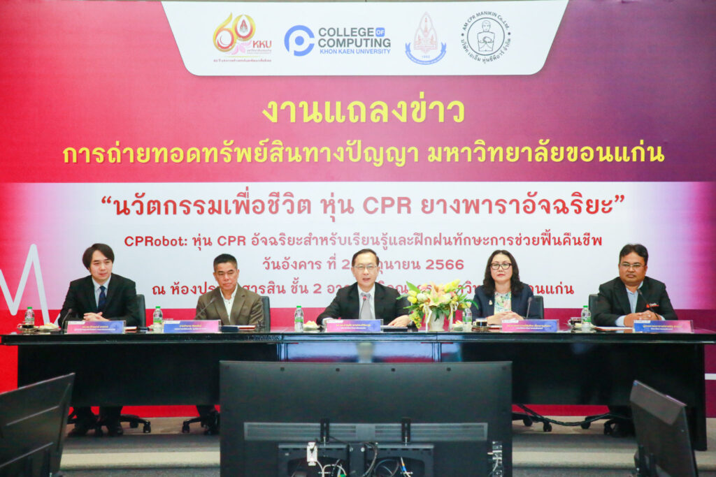 มหาวิทยาลัยขอนแก่น โดย ฝ่ายนวัตกรรมและวิสาหกิจ พร้อมด้วย วิทยาลัยการคอมพิวเตอร์ ศูนย์หัวใจสิริกิติ์ ภาคตะวันออกเฉียงเหนือ ร่วมกับ บริษัทเอเอ็ม หุ่นซีพีอาร์ จำกัด ลงนามการถ่ายทอดทรัพย์สินทางปัญญามหาวิทยาลัยขอนแก่น “นวัตกรรมเพื่อชีวิต หุ่น CPR ยางพาราอัจฉริยะ ” CPRobot (ซี-โปร-บ็อท) : หุ่น CPR อัจฉริยะสำหรับเรียนรู้และ ฝึกฝนทักษะการช่วยฟื้นคืนชีพ โดยมี รศ.นพ.ชาญชัย พานทองวิริยะกุล อธิการบดีมหาวิทยาลัยขอนแก่น นายอำนาจ เกิดอนันต์ กรรมการบริษัทเอเอ็ม หุ่นซีพีอาร์ จำกัด รศ.สิรภัทร เชี่ยวชาญวัฒนา คณบดีวิทยาลัยการคอมพิวเตอร์ รศ.นพ.ภัทรพงษ์ มกรเวช ผู้อำนวยการศูนย์หัวใจสิริกิติ์ ภาคตะวันออกเฉียงเหนือ ผศ.สายยัญ สายยศ หัวหน้าโครงการฯ ณ ห้องประชุมสารสิน ชั้น 2 อาคารสิริคุณากร มหาวิทยาลัยขอนแก่น