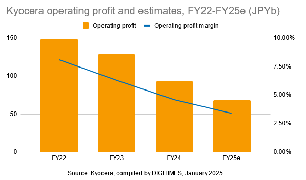 กำไรจากการดำเนินงานรวมของ Kyocera ลดลงอย่างต่อเนื่องในช่วง 3 ปีที่ผ่านมา โดยลดลง 14% เมื่อเทียบเป็นรายปีในปีงบประมาณ 2022 และ 28% ในปีงบประมาณ 2023 สำหรับปีงบประมาณ 2024 บริษัทคาดการณ์ว่ากำไรจากการดำเนินงานจะลดลงอีก 27% ส่งผลให้กำไรจากการดำเนินงานลดลงเหลือ 68,000 ล้านเยน (431 ล้านดอลลาร์สหรัฐฯ)