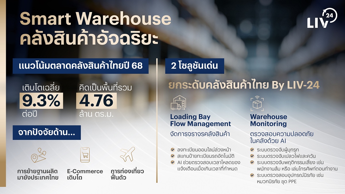 LIV-24 ผู้นำด้านโซลูชันเทคโนโลยีความปลอดภัยและเพิ่มประสิทธิภาพให้กับธุรกิจ เดินหน้ารุกภาคอุตสาหกรรมต่อเนื่อง เปิดตัวโซลูชัน “Smart Warehouse” ปฏิวัติงานคลังสินค้าไทยด้วยเทคโนโลยีอัจฉริยะ ตั้งแต่ AI CCTV Analytics ไปจนถึงการ รวมศูนย์ข้อมูลแบบเรียลไทม์ มุ่งเป้าช่วยภาคธุรกิจลดต้นทุน เพิ่มความปลอดภัย และเสริมความสามารถในการแข่งขัน พร้อมรองรับคลื่นการเติบโตของอุตสาหกรรมไทย โดยเฉพาะในเขตพัฒนาพิเศษภาคตะวันออก (EEC) ที่กลายเป็นจุดยุทธศาสตร์ใหม่ของภูมิภาค