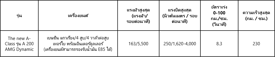 The new A-Class รุ่น A 200 AMG Dynamic มาพร้อมขุมพลังเครื่องยนต์เบนซิน 1.3 ลิตร เทอร์โบแบบ 4 สูบแถวเรียง พร้อมอินเตอร์คูลเลอร์ ในด้านของระบบเครื่องยนต์ถูกพัฒนาขึ้นใหม่ให้มีประสิทธิภาพมากยิ่งขึ้น สะท้อนถึงความพิถีพิถันในการออกแบบตามแนวคิด The art of engineering พร้อมติดตั้งระบบ Cylinder shut-off ที่ทำให้เครื่องยนต์สามารถขับเคลื่อนด้วยลูกสูบเพียง 2 ลูกสูบ เมื่อขับขี่ด้วยความเร็วต่ำ โดยทำงานร่วมกับระบบส่งกำลังแบบเกียร์อัตโนมัติเดินหน้า 7 จังหวะ (7G-DCT) แบบคลัตช์คู่ จับคู่กับระบบอัดอากาศ Turbocharger ที่ทำให้มีกำลังแรงม้าสูงสุดถึง 163 แรงม้า ที่ 5,500 รอบต่อนาที แรงบิดสูงสุด 250 นิวตันเมตร ที่ 1,620 – 4,000 รอบต่อนาที สามารถทำอัตราเร่งจาก 0-100 กิโลเมตร/ชั่วโมง ภายในเวลา 8.3 วินาที มีการติดตั้งระบบเปลี่ยนเกียร์ด้วย Paddle shift ที่พวงมาลัย พร้อมปรับเลือกโหมดการขับขี่ได้ 4 แบบ คือ Eco, Comfort, Sport และ Individual ซึ่งสามารถปรับใช้ตามความเหมาะสมในแต่ละรูปแบบการใช้งาน โดยเสริมความนุ่มนวลในการขับขี่ด้วยระบบช่วงล่างแบบ Lowered comport suspension รองรับการใช้น้ำมันได้ถึง E85 ตามมาตรฐาน EURO6 ซึ่งสามารถทำอัตราสิ้นเปลืองเชื้อเพลิงเฉลี่ยสูงสุด16.7 กิโลเมตรต่อลิตร