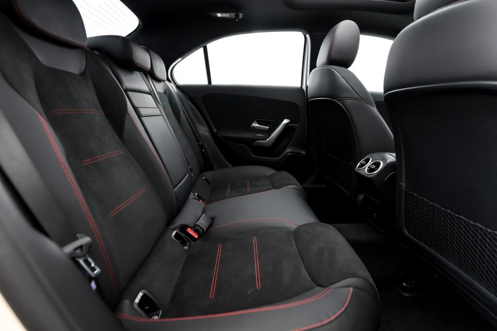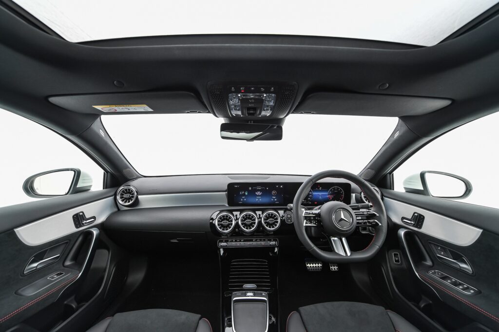 ภายในห้องโดยสารของ The new A-Class ติดตั้งพวงมาลัยมัลติฟังก์ชันดีไซน์ใหม่สไตล์สปอร์ต ตกแต่งด้วยหนัง Nappa เสริมความดุดันด้วยเบาะหุ้มหนัง ARTICO สไตล์สปอร์ต ตัดสลับ MICROCUT microfibre สีดำ ตกแต่งเดินด้ายสีแดง สำหรับเบาะนั่งคู่หน้าติดตั้งระบบปรับไฟฟ้าพร้อมหน่วยบันทึกความจำแบบ memory seat และระบบดันหลัง 4 ทิศทาง บริเวณฝั่งคนขับให้ข้อมูลการขับขี่และแสดงผลผ่านจอมาตรวัดแบบ All-digital instrument display ขนาด 10.25 นิ้ว พร้อมควบคุมการสั่งการภายในรถ ผ่านหน้าจอกลางระบบสัมผัสขนาด 10.25 นิ้ว รองรับระบบเชื่อมต่อผ่านสมาร์ทโฟนทั้ง Apple CarPlay™ และ Android Auto™ รวมถึงฟังก์ชันและเทคโนโลยีอำนวยความสะดวก อาทิ ระบบปรับโหมดการขับขี่แบบ DYNAMIC SELECT ระบบควบคุมอุณหภูมิอัตโนมัติ THERMOTRONIC แยกปรับอุณหภูมิ 2 โซน พร้อมช่องปรับอากาศผู้โดยสารตอนหลัง ระบบชาร์จโทรศัพท์มือถือแบบไร้สาย พร้อมช่อง USB Type-C 4 ช่อง สร้างบรรยากาศที่เหนือชั้นด้วยไฟ Ambient Light รอบห้องโดยสารแบบปรับได้ 64 เฉดสี และครั้งแรกของ The new A-Class กับหลังคาพาโนรามิคซันรูฟแบบไฟฟ้าที่ช่วยเพิ่มความโปร่งสบายของห้องโดยสาร
