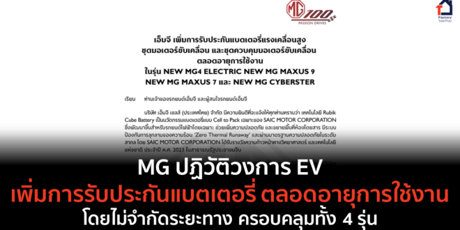 MG ประกาศเพิ่มการรับประกันแบตเตอรี่แรงเคลื่อนสูง ชุดมอเตอร์ขับเคลื่อน และชุดควบคุมมอเตอร์ขับเคลื่อน ตลอดอายุการใช้งาน ในรุ่น New MG4 Electric, New MG Maxus 9, New MG Maxus 7 และ New MG Cyberster การรับประกันนี้สำหรับลูกค้าที่จดทะเบียนในนามบุคคล ครอบคลุมลูกค้าปัจจุบัน และลูกค้าที่จะซื้อรถทั้ง 4 รุ่นในอนาคต โดยไม่จำกัดเฉพาะลูกค้าที่เป็นเจ้าของคนแรกเท่านั้น ที่มา : MG Thailand