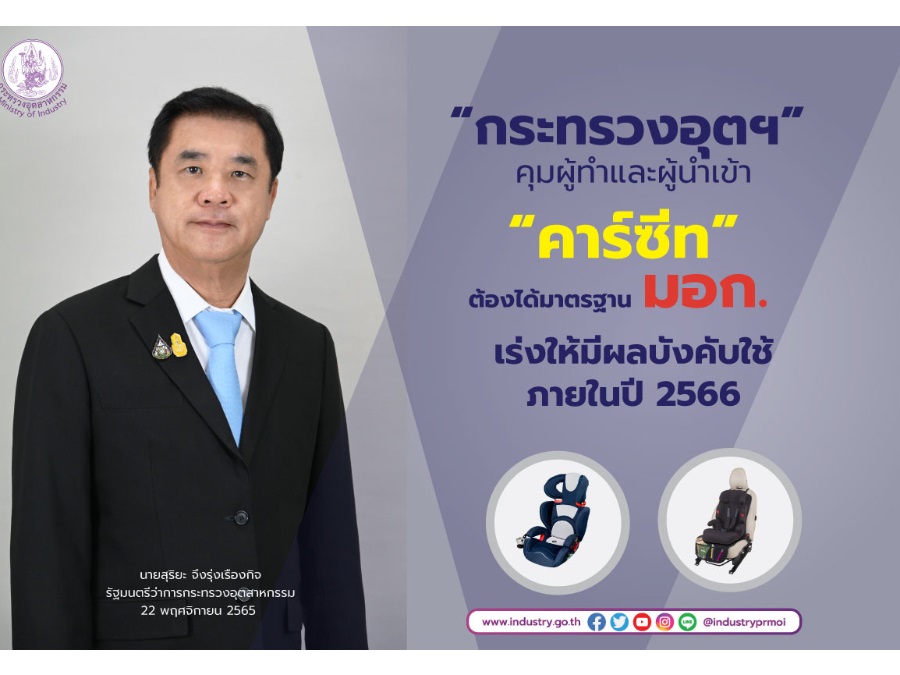 นายสุริยะ จึงรุ่งเรืองกิจ รัฐมนตรีว่าการกระทรวงอุตสาหกรรม เปิดเผยว่า มติการประชุมคณะกรรมการมาตรฐานผลิตภัณฑ์อุตสาหกรรม (กมอ.) เมื่อวันที่ 14 พฤศจิกายน 2565 ที่ผ่านมา เห็นชอบให้คาร์ซีท หรือที่นั่งนิรภัยสำหรับเด็ก ซึ่งเป็นอุปกรณ์เสริมใช้สำหรับให้เด็กนั่งโดยสารบนรถยนต์เพื่อเพิ่มความปลอดภัย เป็นสินค้าควบคุม เพื่อคุ้มครองความปลอดภัยแก่ประชาชนโดยเฉพาะเด็กเล็ก ซึ่งสอดคล้องตามภารกิจของกระทรวงอุตสาหกรรมด้านการคุ้มครองประชาชนให้ปลอดภัยจากการใช้สินค้าที่ได้มาตรฐาน โดยเตรียมออกกฎหมายเพื่อควบคุมให้ผู้ทำและผู้นำเข้าคาร์ซีททุกราย ต้องทำและนำเข้าเฉพาะคาร์ซีทที่ผ่านการทดสอบความปลอดภัยตามเกณฑ์มาตรฐาน มอก. เท่านั้นเพื่อยกระดับความปลอดภัยในการใช้รถใช้ถนน และเป็นตัวช่วยสำคัญในการตัดสินใจเลือกซื้อสินค้าของประชาชนผู้บริโภค