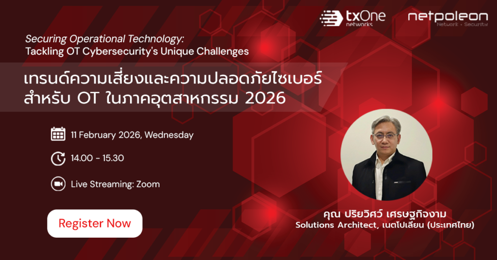 Netpoleon ขอเชิญ IT Manager, IT Security Specialist, System Administrator, Network Security, IT Support และผู้ปฏิบัติงานฝ่าย IT และ OT เข้าร่วมฟัง Netpoleon Webinar ในหัวข้อ “เทรนด์ความเสี่ยงและการรักษาความปลอดภัยไซเบอร์สำหรับ OT ในภาคอุตสาหกรรม 2026”