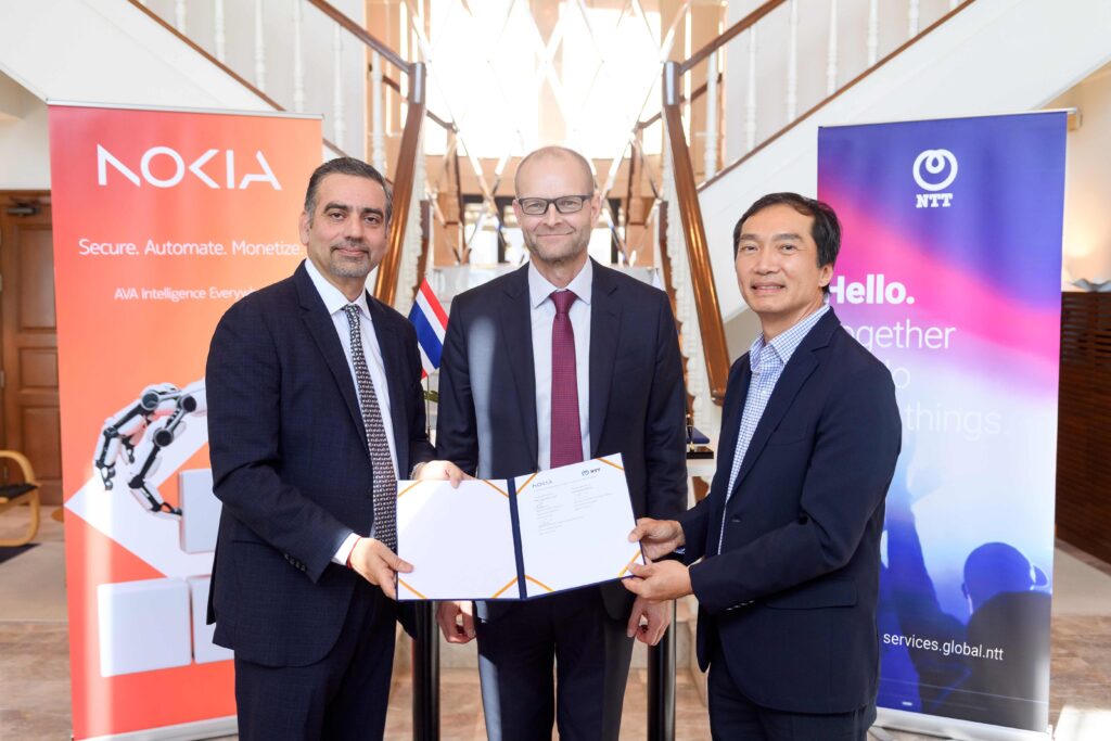 กรุงเทพฯ, ประเทศไทย – โนเกีย ประกาศความร่วมมือทางธุรกิจกับเอ็นทีที (NTT) เพื่อให้บริการโซลูชันเครือข่ายไร้สายระดับองค์กรสำหรับองค์กรธุรกิจกว่า 3.2 ล้านรายทั่วประเทศไทย เพื่อเร่งเดินหน้าสู่ความเป็นดิจิทัลอย่างแท้จริงซึ่งจะช่วยเพิ่มปริมาณผลผลิต ประสิทธิภาพการดำเนินงาน และความปลอดภัยของคนงานที่สามารถประเมินผลได้  โดยโซลูชัน 5G ไร้สายระดับองค์กรของโนเกียที่ถูกนำไปใช้งานในหลายองค์กรทั่วประเทศ จะเป็นการเปลี่ยนรูปแบบการใช้งานแอปพลิเคชันสำคัญสำหรับธุรกิจและการใช้งานทั่วทุกภาคส่วนที่มีความสำคัญต่อเศรษฐกิจของประเทศ ไม่ว่าจะเป็นด้านการผลิต การทำเหมืองแร่ เฮลธ์แคร์ และการศึกษา