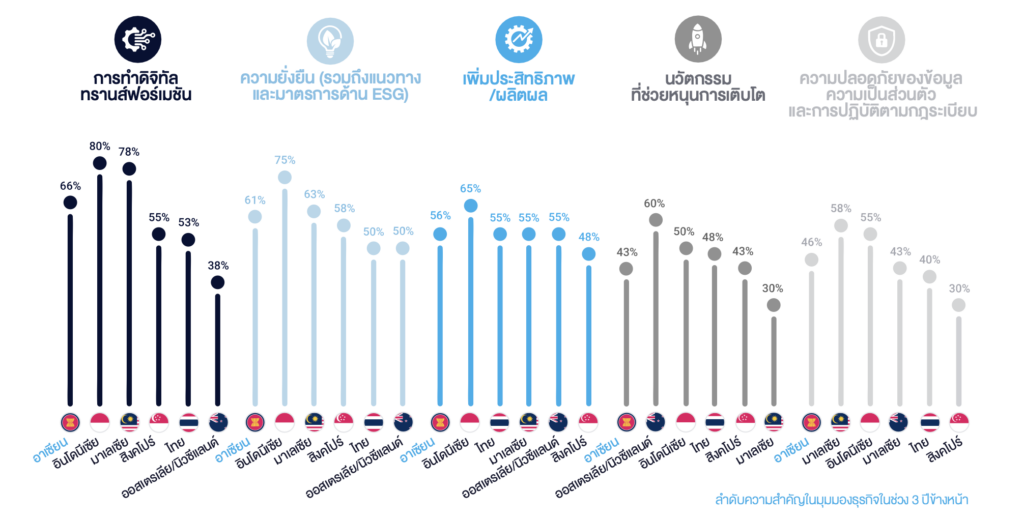 - การทำดิจิทัลทรานส์ฟอร์เมชัน (53%) และความยั่งยืน (50%) ถือเป็นประเด็นติดอันดับที่องค์กรต่างๆ ในไทยให้ความสำคัญสูงสุด