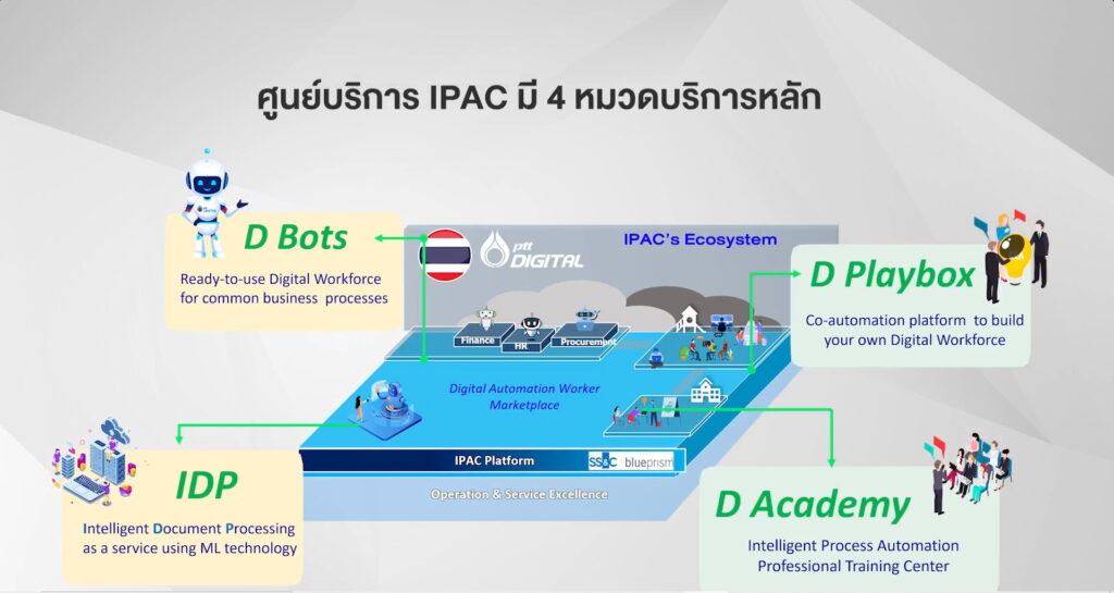 ปัจจุบัน PTT Digital มีทีมผู้เชี่ยวชาญเทคโนโลยี Intelligent Automation จำนวนกว่า 60 คน ที่ผ่านการรับรองมาตรฐานสากลด้านการพัฒนาการใช้งานเทคโนโลยี IA และ RPA ในทุกกลุ่มธุรกิจอุตสาหกรรมจาก SS&C Blue Prism ซึ่งเป็นผู้นำด้านซอฟต์แวร์ IA และ RPA ระดับโลก ที่ผ่านมา PTT Digital ได้พัฒนาและดูแลการใช้งานบอท หรือ Digital Worker ให้กับลูกค้าในบริษัทชั้นนำรวมกว่า 100 ตัว โดยออกแบบฟังก์ชันงานที่แตกต่างกัน มากกว่า 130 รายการ ช่วยประหยัดเวลาทำงานได้มากกว่า 150,000 ชั่วโมง ซึ่งเป็นผลจากการนำระบบการทำงานอัตโนมัติเข้ามาช่วยเพิ่มประสิทธิภาพในกระบวนการทำงานและเสริมความคล่องตัวให้องค์กรมากยิ่งขึ้น โดยบริการ IPAC เหมาะกับบริษัททุกขนาด โดยเฉพาะในธุรกิจการผลิต ธุรกิจการเงิน การธนาคาร การประกันภัย และธุรกิจสุขภาพ เป็นต้น