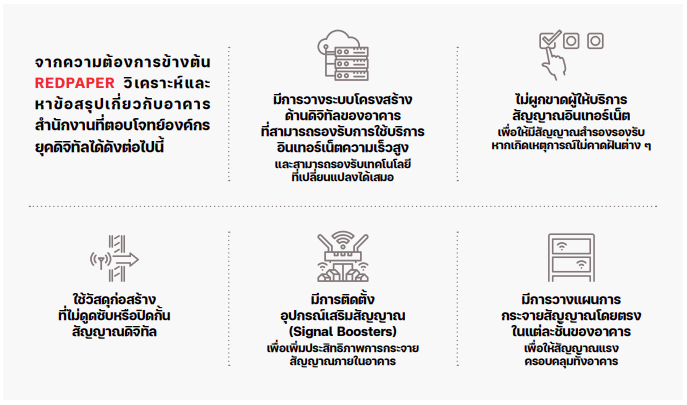 รายงาน REDPAPER ฉบับที่ 5 เรื่อง ไขรหัสความสำเร็จธุรกิจอาคารสำนักงาน: 3 กุญแจดอกใหม่สู่ Tomorrow’s Office ดึงดูดผู้เช่าเต็ม ผูกใจผู้ใช้บริการ ศึกษาปัจจัยที่ผู้ประกอบการและพนักงานให้ความสำคัญสำหรับ “ออฟฟิศแห่งอนาคต” ที่ตอบโจทย์ด้านความสะดวก ช่วยเสริมประสิทธิภาพการทำงานให้กับทั้งองค์กรและพนักงาน โดยจากการสำรวจผู้ประกอบการและชาวออฟฟิศในย่าน CBD ของกรุงเทพฯ[1] พบว่า 3 ปัจจัยสำคัญอันดับต้นที่มีผลต่อประสิทธิภาพการทำงานและความพึงพอใจของกลุ่มผู้ตอบแบบสอบถาม คือ อาคารสำนักงานต้องตอบโจทย์ด้านดิจิทัล นวัตกรรม และ บรรยากาศสถานที่ทำงาน