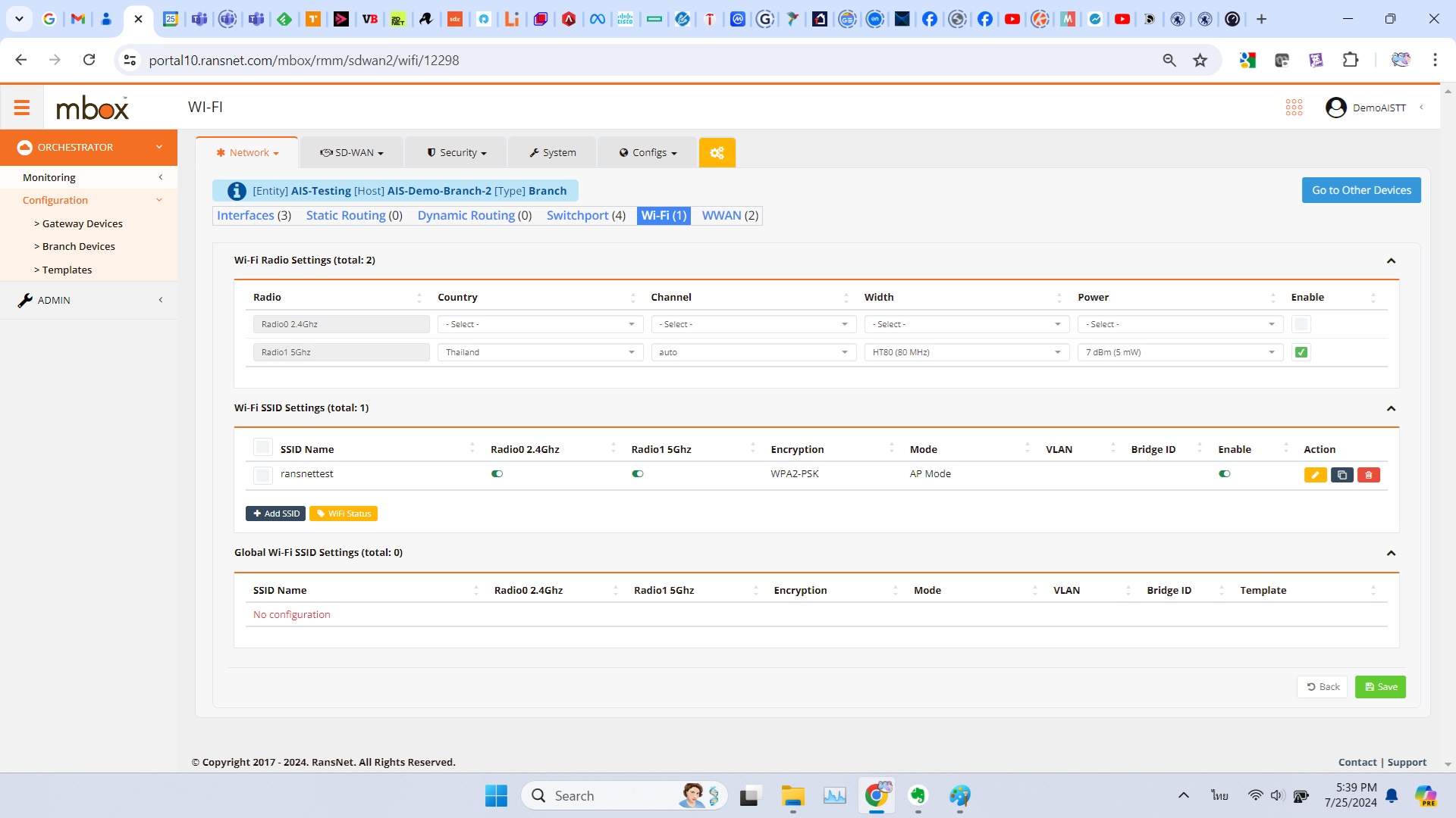 ระบบดูไม่ได้มีความซับซ้อนอะไร ดังนั้นในขั้นตอนนี้ที่เราต้องการสร้าง Wi-Fi SSID ก็ทำการเลือกที่เมนู Orchestrator > Configuration > Templates > Wireless และทำการสร้าง SSID ที่ต้องการหากต้องการสร้างเป็น Policy กลางและนำไปใช้กับหลายอุปกรณ์ แต่ในการทดสอบนี้เราจะลองทำกับอุปกรณ์เพียงชุดเดียวก่อน ก็สามารถเข้าไปที่เมนู Orchestrator > Configuration > Branch Devices > SD-Branch และเลือกอุปกรณ์ที่ต้องการ ก่อนจะเข้าไปตั้งค่าในปุ่ม Wi-Fi โดยตรงเลยก็ได้เช่นกัน