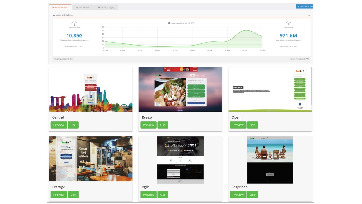 ความน่าสนใจอีกประการของโซลูชันนี้ก็คือการที่มีระบบสำหรับสร้างหน้า Captive Portal มาให้ด้วยในแบบของ Content Management System (CMS) ที่จะช่วยให้เราสามารถสร้างหน้า Captive Portal ขึ้นมาใช้ได้อย่างสวยงามง่ายๆ โดยไม่ต้องเขียนโค้ดเอง ไม่ต้องออกแบบเองมากนัก มี Template พร้อมให้เอามาแก้ไข หรือจะ Drag & Drop ลากวางองค์ประกอบต่างๆ ด้วยตนเองก็ได้ ซึ่งก็ถือว่าสะดวกไม่น้อย พร้อมทั้งยังมีระบบ Database หลังบ้านมาให้พร้อมใช้ได้อีกด้วย ทำให้ไม่ต้องไปเตรียม Server ภายนอกเองแต่อย่างใด