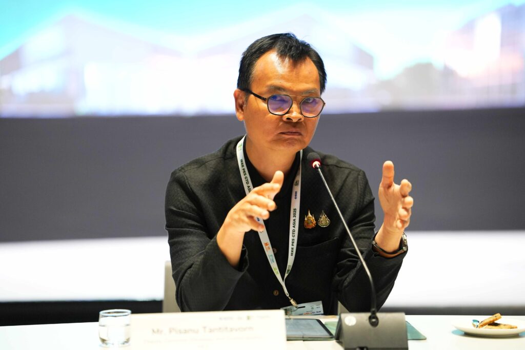 คุณวุฒิกร อนุศาสน์อมรกุล ผู้จัดการฝ่ายนวัตกรรมและกลยุทธ์ธุรกิจพลังงาน บริษัท ปตท.จำกัด (มหาชน) กล่าวถึงความท้าทายแบบคู่ขนานของประเทศไทย ในการบริหารจัดการทั้งความเสี่ยงทางกายภาพจากสภาพภูมิอากาศ และความเสี่ยงจากการเปลี่ยนผ่าน โดยปตท.มองว่า แม้พลังงานหมุนเวียนจะเป็นอนาคต แต่ความมั่นคงทางพลังงานยังคงเป็นภารกิจสำคัญสูงสุด จึงมุ่งเน้นการเปลี่ยนผ่านโดยใช้ก๊าซธรรมชาติเป็นเชื้อเพลิงหลัก ควบคู่ไปกับการพัฒนาเทคโนโลยีสำคัญอย่างโครงการนำร่องดักจับและกักเก็บคาร์บอนที่แหล่งอาทิตย์ (Carbon Capture and Storage – CCS) ได้บรรจุไว้ในเป้าหมายการการดำเนินงานด้านการเปลี่ยนแปลงสภาพภูมิอากาศของประเทศ (Nationally Determined Contributions – NDC) ฉบับปรับปรุงใหม่แล้ว
