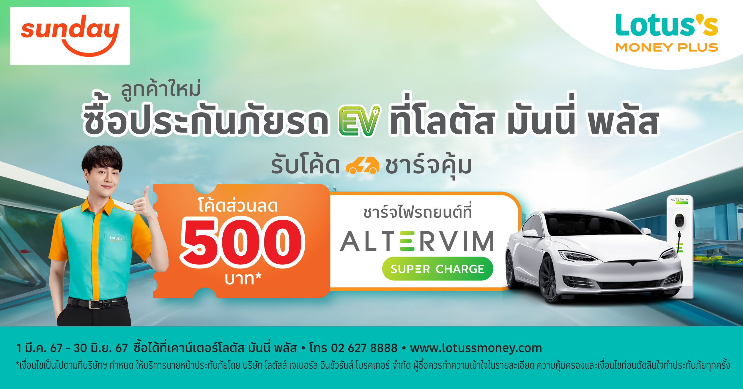 สามารถซื้อผลิตภัณฑ์ประกันรถยนต์ และรถยนต์ไฟฟ้าของซันเดย์ ได้แล้ววันนี้ที่ เคาน์เตอร์ โลตัส มันนี่ พลัส กว่า 200 สาขา ในห้างโลตัสทั่วประเทศ พิเศษ! ตั้งแต่ 1 มีนาคม – 30 มิถุนายน 2567 ลูกค้าใหม่ที่ซื้อประกันภัยรถยนต์ไฟฟ้าของซันเดย์ ณ เคาน์เตอร์บริการฯ รับโค้ดส่วนลด 500 บาท สำหรับชาร์จไฟที่สถานี Altervim Super Charge หรือรับสิทธิ์ผ่อน 0% นานสูงสุด 10 เดือน เมื่อเลือกชำระผ่านบัตรเครดิตที่ร่วมรายการ (เงื่อนไขเป็นไปตามที่กำหนด) ข้อมูลเพิ่มเติม https://bit.ly/49Gkjdr