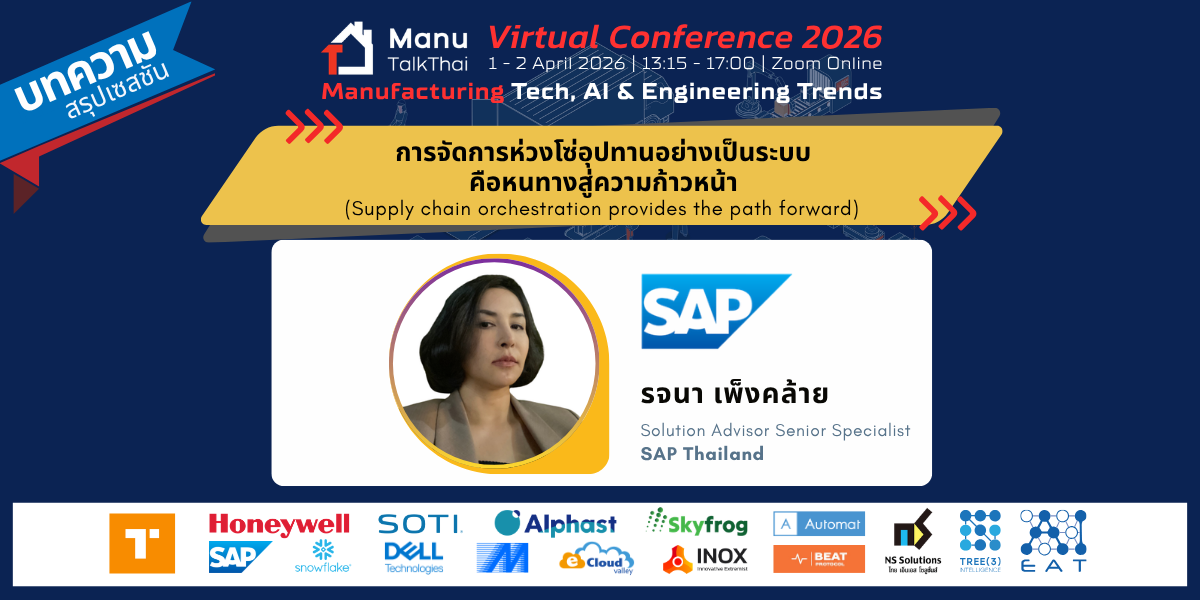 จบลงไปแล้วอย่างสวยงามสำหรับงาน MTT Virtual Conference 2026: Manufacturing Tech, AI & Engineering Trends ที่จัดขึ้นเมื่อวันที่ 1-2 เมษายน 2026 ที่ผ่านมา วันนี้ทีมงาน ManuTalkThai ขอพาทุกท่านมาย้อนรอยหนึ่งในเซสชันไฮไลต์ที่น่าสนใจจากงานครั้งนี้ ในหัวข้อ “Supply chain orchestration provides the path forward” (การจัดการห่วงโซ่อุปทานอย่างเป็นระบบคือหนทางสู่ความก้าวหน้า) บรรยายโดย คุณรจนา เพ็งคล้าย Solution Advisor Senior Specialist จาก SAP Thailand ที่ได้มาเจาะลึกถึงการพลิกโฉมการบริหารจัดการซัพพลายเชนในภาคการผลิต (Manufacturing) ด้วยการผสานข้อมูลและ AI เข้าด้วยกัน