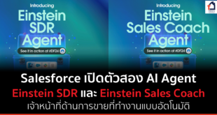 กรุงเทพฯ – 26 สิงหาคม 2567 – วันนี้ Salesforce (เซลส์ฟอร์ซ) ผู้นำ CRM อันดับ 1 สำหรับการขาย ได้เปิดตัวเจ้าหน้าที่ผู้ให้บริการ (Agent) ด้านการขาย ที่สามารถทำงานได้ด้วยตัวเองโดยอัตโนมัติอย่างเต็มรูปแบบ สองบริการใหม่ ได้แก่ Einstein Sales Development Rep (SDR) Agent และ Einstein Sales Coach Agent โดย Agent ด้านการขายเหล่านี้ได้พัฒนาขึ้นบน แพลตฟอร์ม Einstein 1 Agentforce ของ Salesforce เพื่อช่วยเร่งสร้างการเติบโตให้ทีมงานฝ่ายขายขององค์กร และจะเปิดให้ใช้งานโดยทั่วไปในเดือนตุลาคมนี้