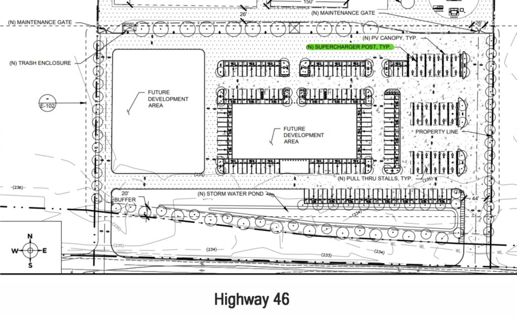ตามการยื่นขอใบอนุญาตก่อสร้าง (ผ่าน MarcoRP) จะมีแผง Supercharger นับได้จำนวน 164 หัวชาร์จที่ระบุในแผนผังการออกแบบที่สถานีใหม่ สิ่งนี้ถ้าหากมีการก่อสร้างเกิดขึ้น จะทำให้เป็น Supercharger ที่ใหญ่ที่สุดในโลกทันที