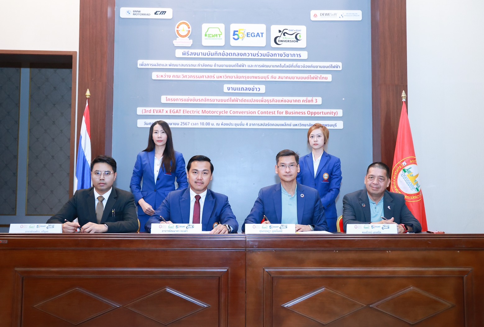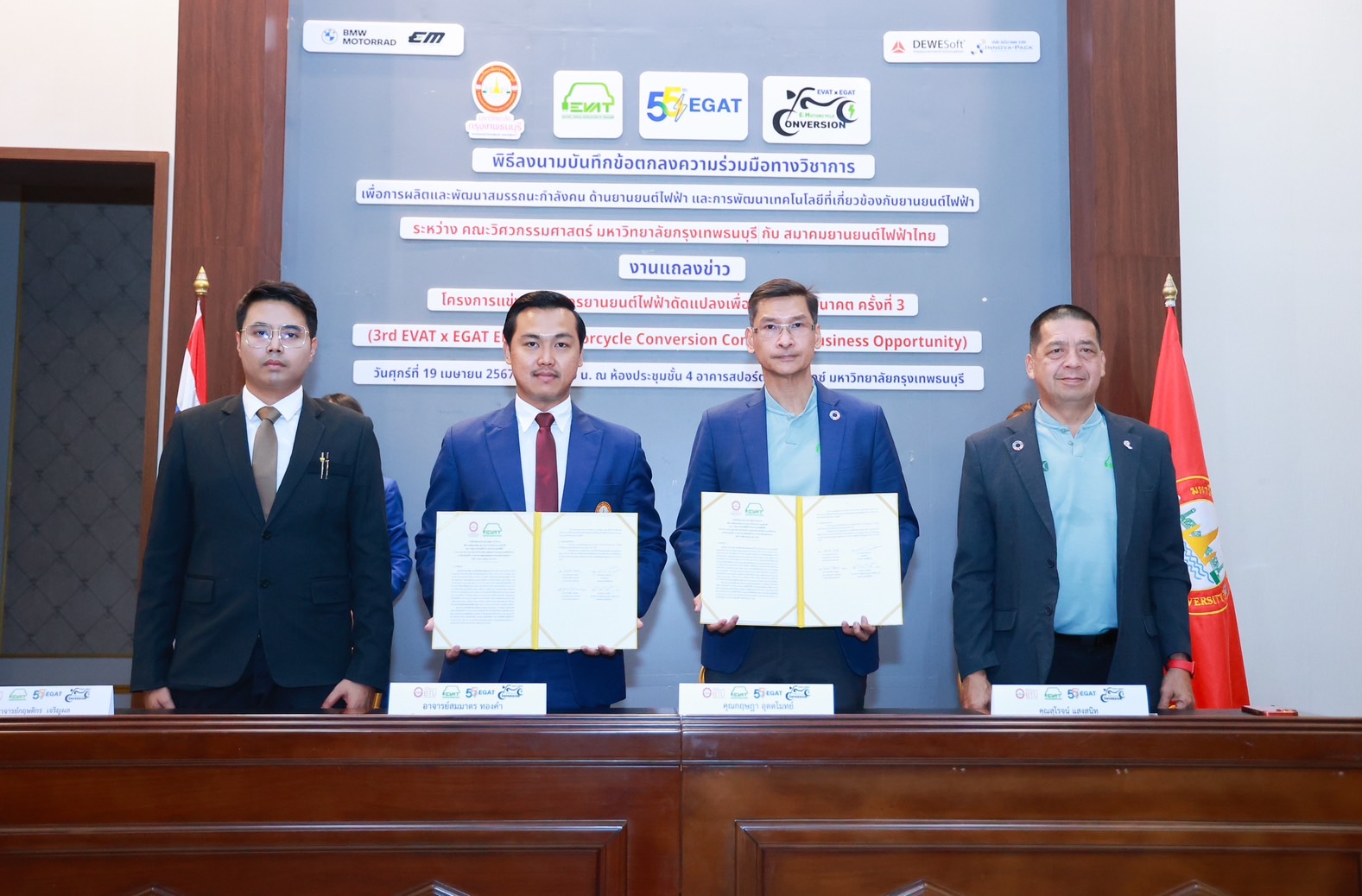 เมื่อวันที่ 19 เมษายน พ.ศ.2567 สมาคมยานยนต์ไฟฟ้าไทย (EVAT) นำโดย นายกฤษฎา อุตตโมทย์ นายกสมาคมฯ พร้อมด้วย นายชัยวุฒิ หลักเมือง ผู้ช่วยผู้ว่าการบริหารจัดการความยั่งยืน การไฟฟ้าฝ่ายผลิตแห่งประเทศไทย (กฟผ.) เเละ อาจารย์สมมาตร ทองคำ คณบดีคณะวิศวกรรมศาสตร์ มหาวิทยาลัยกรุงเทพธนบุรี จัดงานเเถลงข่าวโครงการแข่งขันรถจักรยานยนต์ไฟฟ้าดัดแปลงเพื่อธุรกิจแห่งอนาคต ครั้งที่ 3 และ พิธีลงนามบันทึกข้อตกลงความร่วมมือทางวิชาการ เพื่อการผลิตและพัฒนาสมรรถนะกำลังคนด้านยานยนต์ไฟฟ้า และการพัฒนาเทคโนโลยีที่เกี่ยวข้องกับยานยนต์ไฟฟ้า ระหว่างคณะวิศวกรรมศาสตร์ มหาวิทยาลัยกรุงเทพธนบุรี กับ สมาคมยานยนต์ไฟฟ้าไทย ณ ห้องประชุมชั้น 4 อาคารสปอร์ตคอมแพล็ค มหาวิทยาลัยกรุงเทพธนบุรี