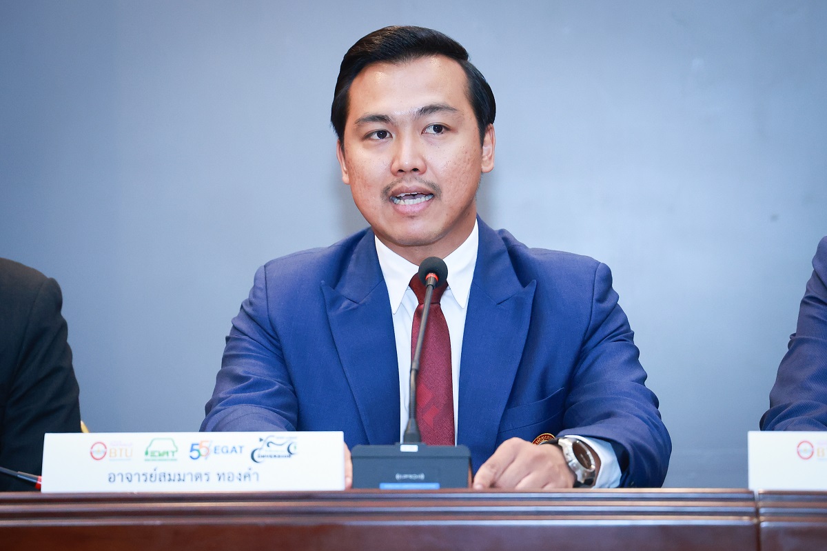 ด้าน อาจารย์สมมาตร ทองคำ คณบดีคณะวิศวกรรมศาสตร์ ซึ่งได้รับมอบหมายจาก ศาสตราจารย์ ดร.บังอร เบ็ญจาธิกุล อธิการบดี มหาวิทยาลัยกรุงเทพธนบุรี ให้เป็นผู้แทนในการเเถลงข่าวในครั้งนี้ เผยว่า “ทางมหาวิทยาลัยกรุงเทพธนบุรี มีความยินดีเป็นอย่างยิ่ง ที่ได้มีโอกาสร่วมมือกับทางสมาคมยานยนต์ไฟฟ้าไทย ทั้งในเรื่องความร่วมมือการจัดงานการแข่งขันรถจักรยานยนต์ไฟฟ้าดัดแปลงเพื่อธุรกิจแห่งอนาคต ครั้งที่ 3 ทางมหาวิทยาลัยกรุงเทพธนบุรียินดีสนับสนุนให้ใช้พื้นที่ของมหาวิทยาลัยเป็นสถานที่จัดงานการเเข่งขัน และเรื่องความร่วมมือทางวิชาการของคณะวิศวกรรมศาสตร์ มหาวิทยาลัยกรุงเทพธนบุรี กับสมาคมยานยนต์ไฟฟ้าไทย ซึ่งคณะวิศวกรรมศาสตร์ มหาวิทยาลัยกรุงเทพธรบุรี มีศักยภาพ เเละพร้อมตอบรับการเปลี่ยนผ่านเทคโนโลยีในโลกปัจจุบันที่ได้มีการพัฒนาไปอย่างรวดเร็ว และจะมีส่วนช่วยในการผลักดันการพัฒนาเทคโนโลยีที่เกี่ยวข้องกับยานยนต์ไฟฟ้า เพื่อการพัฒนาอย่างยั่งยืนในอุตสาหกรรมยานยนต์ไฟฟ้าในประเทศไทยให้เติบโตอย่างมั่นคงเเละเเข็งเเรง อีกทั้งยังเป็นการตอบรับนโยบายกระทรวง อว. เพื่ออุตสาหกรรมยานยนต์ไฟฟ้า (อว. For EV) มหาวิทยาลัยกรุงเทพธนบุรีได้ส่งเสริมการใช้รถ EV ในพื้นที่มหาวิทยาลัย คณะวิศวกรรมศาสตร์ได้เตรียมเปิดหลักสูตรเพื่อผลิตและพัฒนาสมรรถนะกำลังคนด้าน EV รวมถึงการส่งเสริมการวิจัยพัฒนานวัตกรรมด้าน EV ซึ่งมหาวิทยาลัยกรุงเพทธนบุรีมุ่งมั่นที่จะเป็นเครือข่ายที่สำคัญในการขับเคลื่อนนโยบายด้าน EV ของประเทศ”